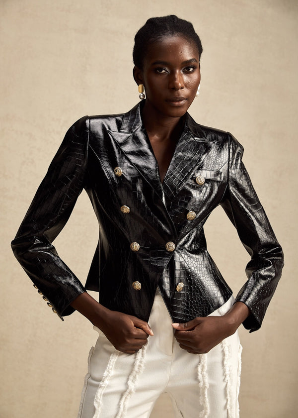 Double-Breasted Lace-Trimmed Padded-Shoulder Blazer