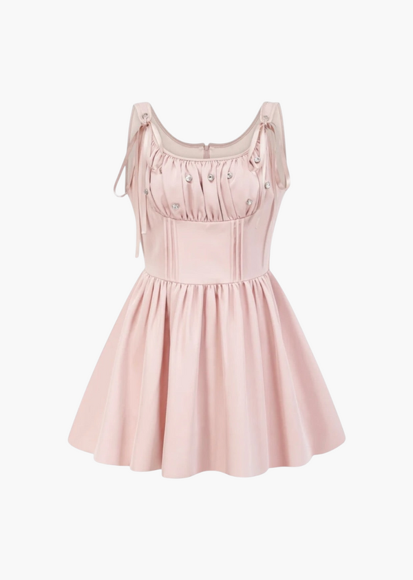 Satin Babydoll Mini Dress with Tie Straps and Rhinestone