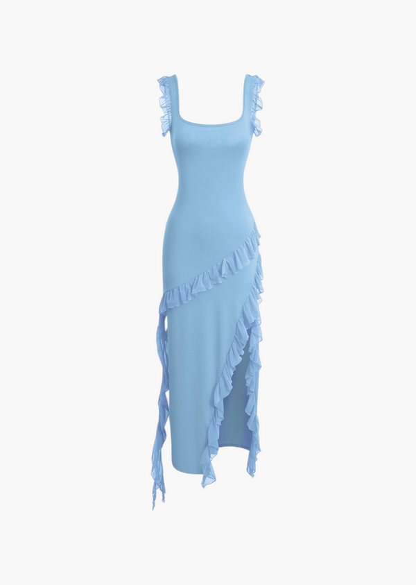 Sequined Ruffle Thigh-Slit Maxi Dress