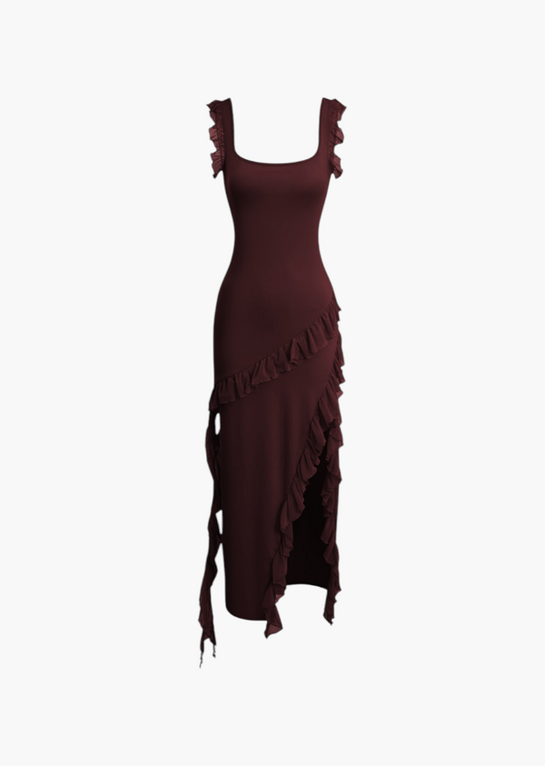 Square Neck Mesh Inserts Ruched Maxi Dress