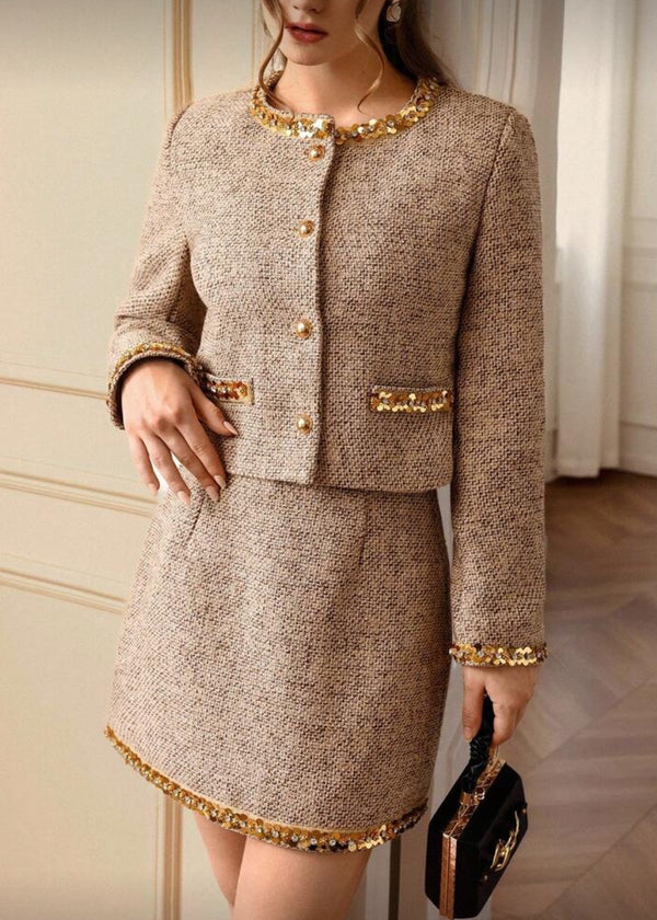 Tweed Sequin Trim Collarless Jacket Skirt Set