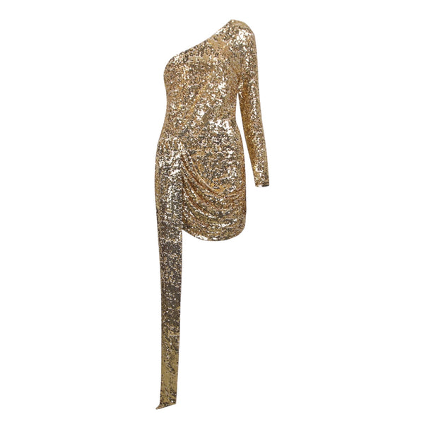 One-Shoulder Side Draped Wrap Sequin Dress - Gold