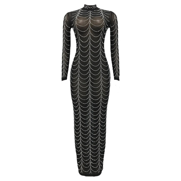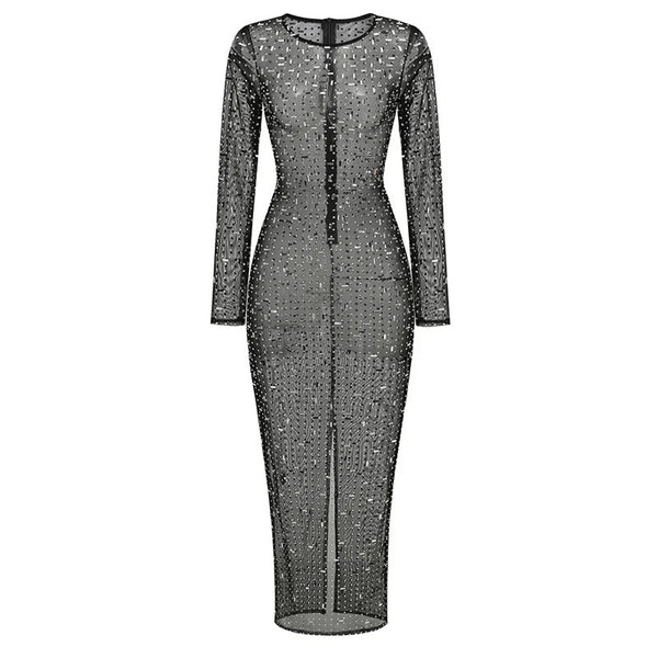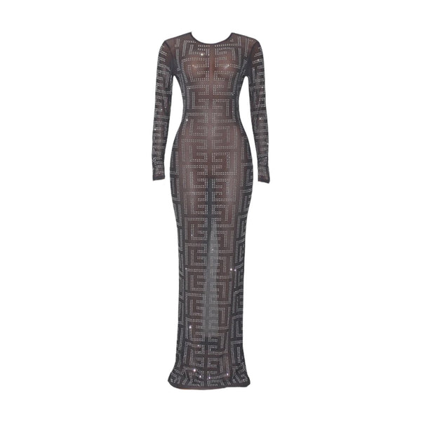 Rhinestone Decorated Long Sleeved Mesh Maxi Dress