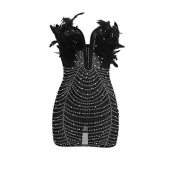 V Neck Feather Patchwork Mini Bodycon Dress