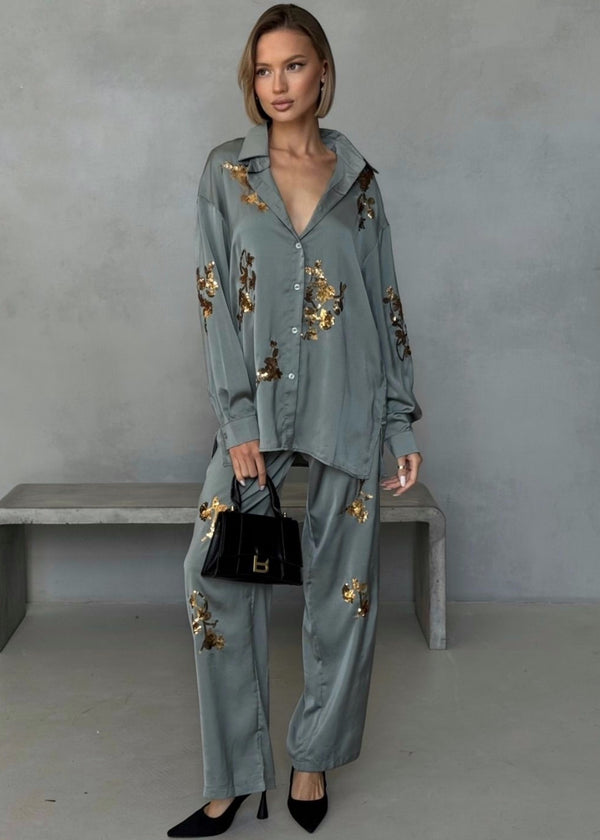 Embroidered Satin Two-Piece Set with Button-Up Shirt and Tailored Pants
