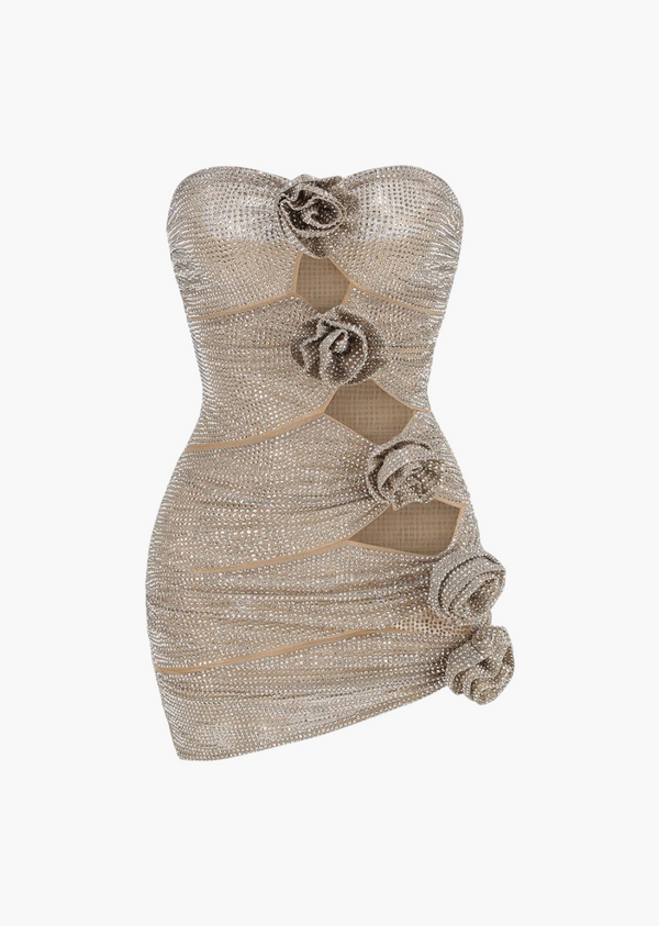 Square Neck Crystal Embellished Long Sleeve Mini Dress