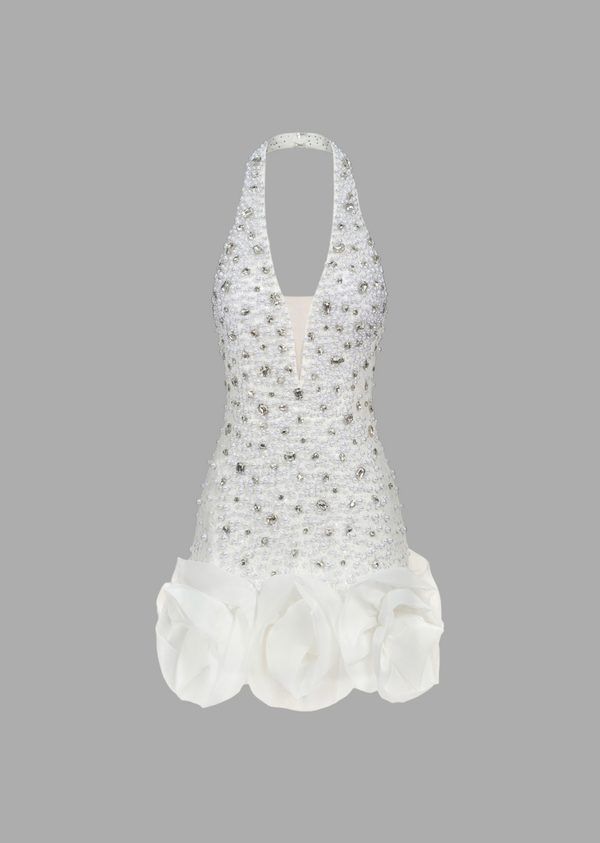 Beaded Organza Ruffle Detail Halter Mini Dress
