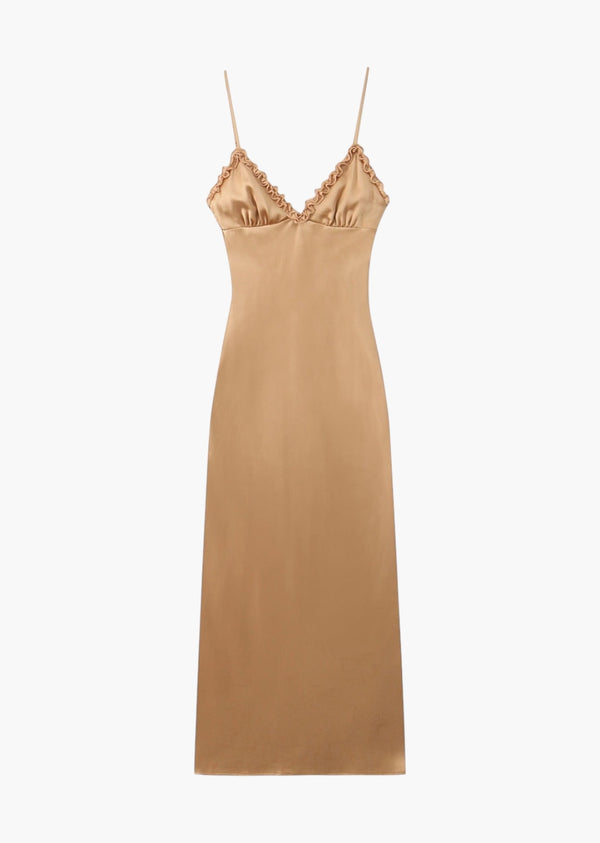 V-Neck Ruffle Trim Satin Slip Dress