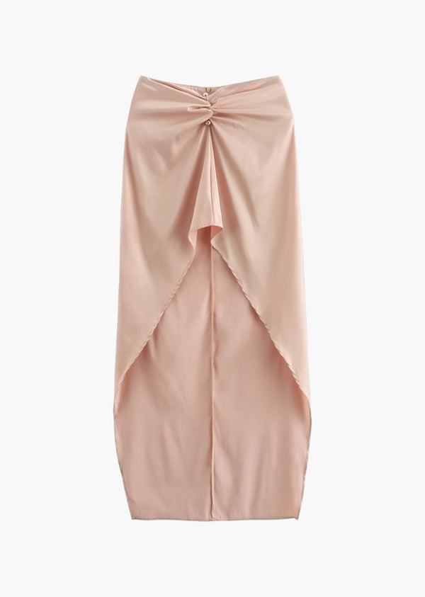 Asymmetrical Hem Ruched Satin Midi Skirt