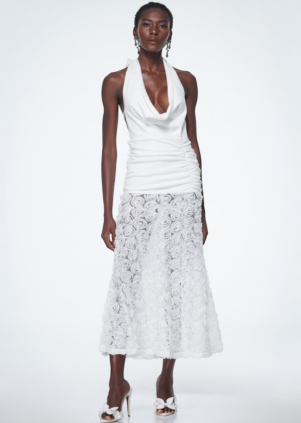3D Floral Decor Ruffle Trim Halter Maxi Dress