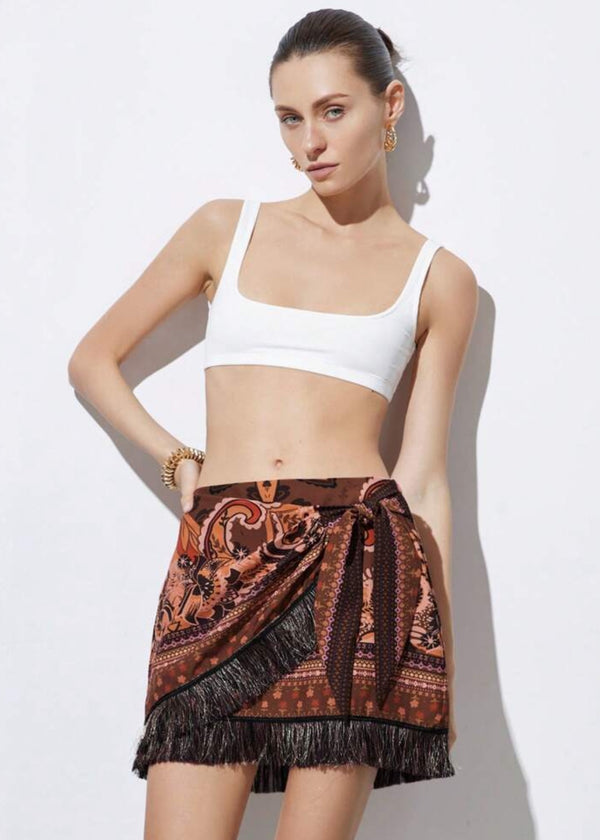 Printed Fringe Hem Wrap Mini Skirt