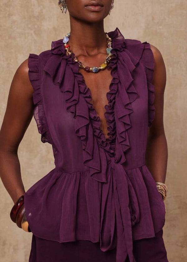 Sleeveless Ruffle Neckline Peplum Waist Blouse