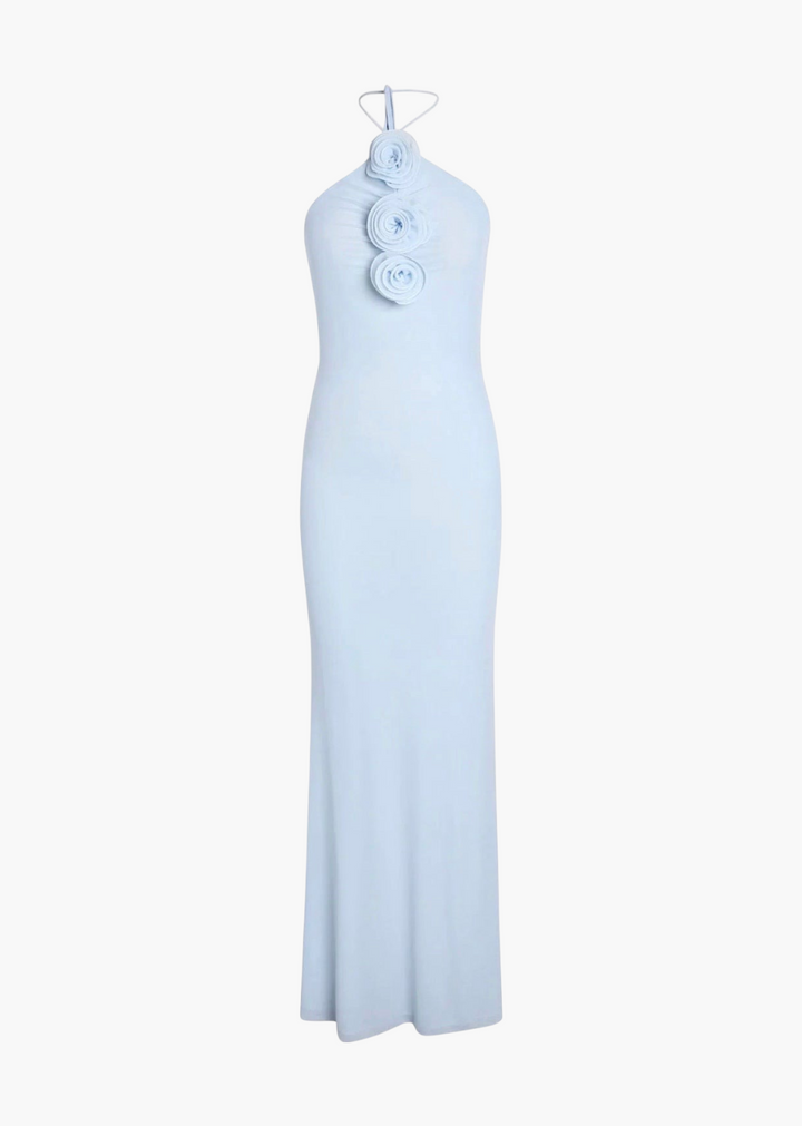 This floor-length gown features a halter neckline with a distinctive floral applique, a ruched bodice, and a fitted silhouette that flares at the hem. The dress is constructed from a smooth, flowing fabric, creating a graceful and elegant drape.