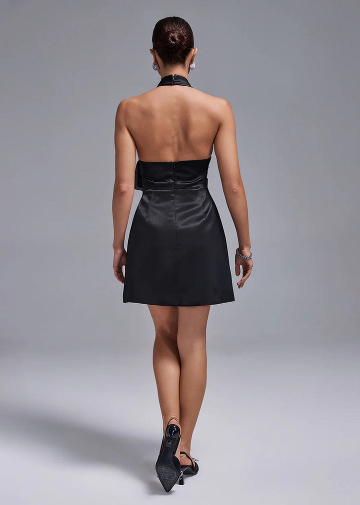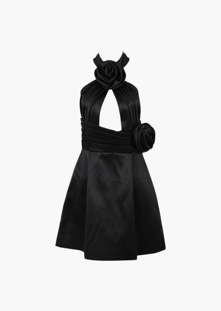 This elegant mini dress features a halter neckline with a high collar that fastens at the back. The bodice includes a stylish keyhole cut-out at the chest, framed by structured fabric rosettes. The design is cinched at the waist before flowing into a chic A-line skirt, creating a sophisticated silhouette perfect for special occasions.