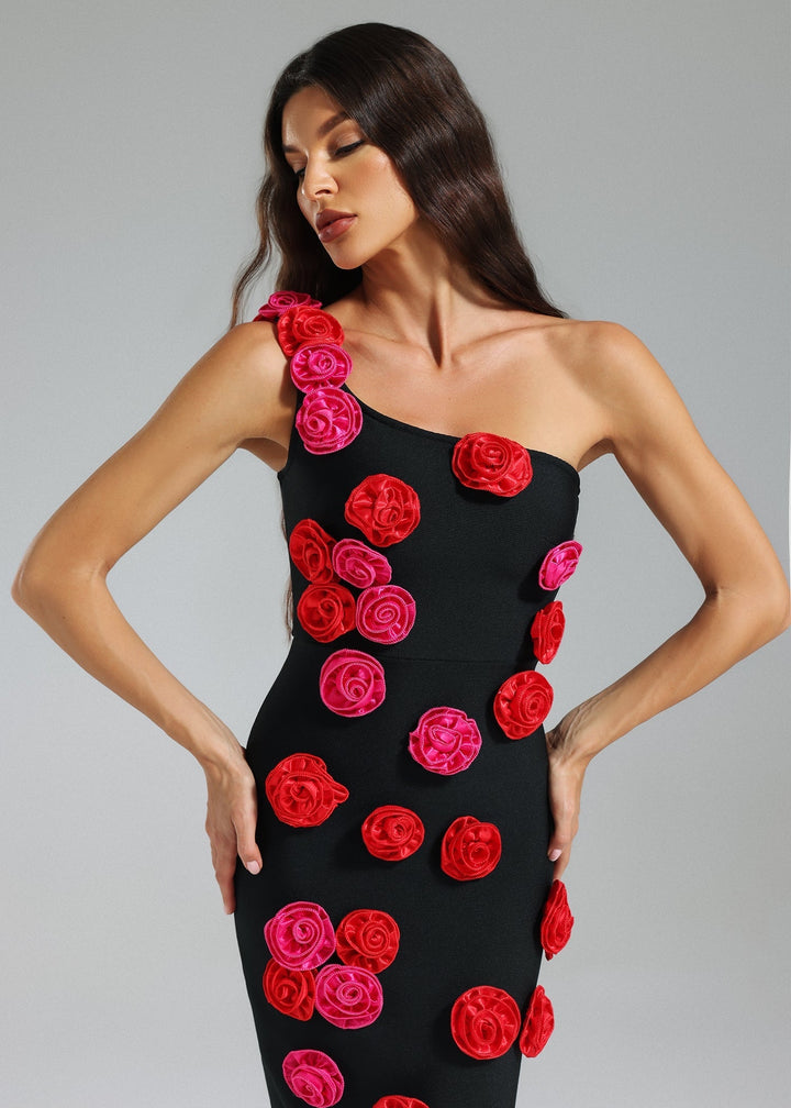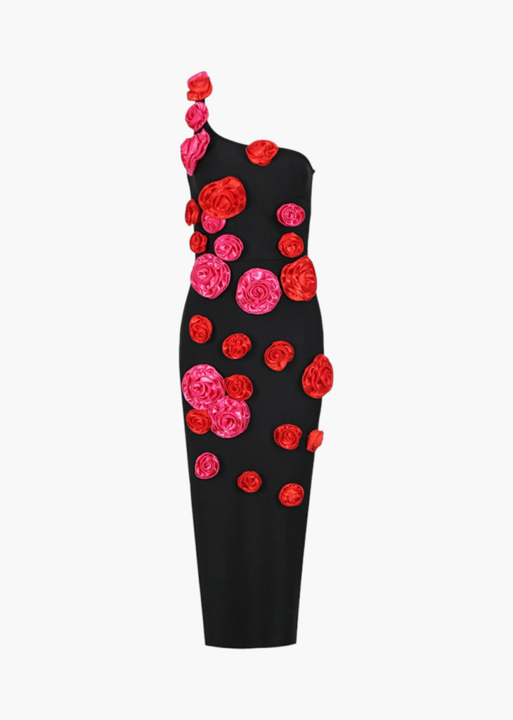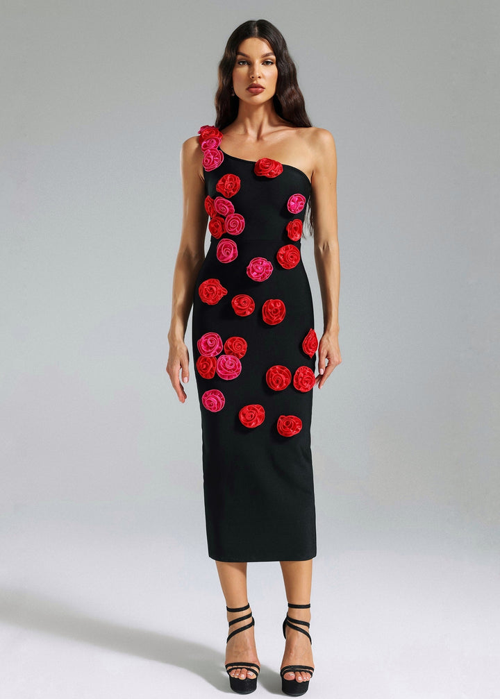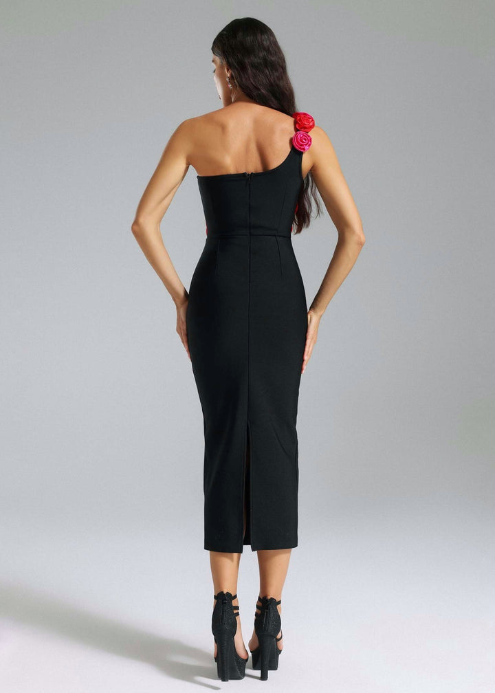 This sophisticated midi dress features a one-shoulder neckline and a form-fitting sheath silhouette. The dress is adorned with three-dimensional floral appliqués that are scattered across the front and shoulder. It falls to a midi length, with a slit at the back for ease of movement.
