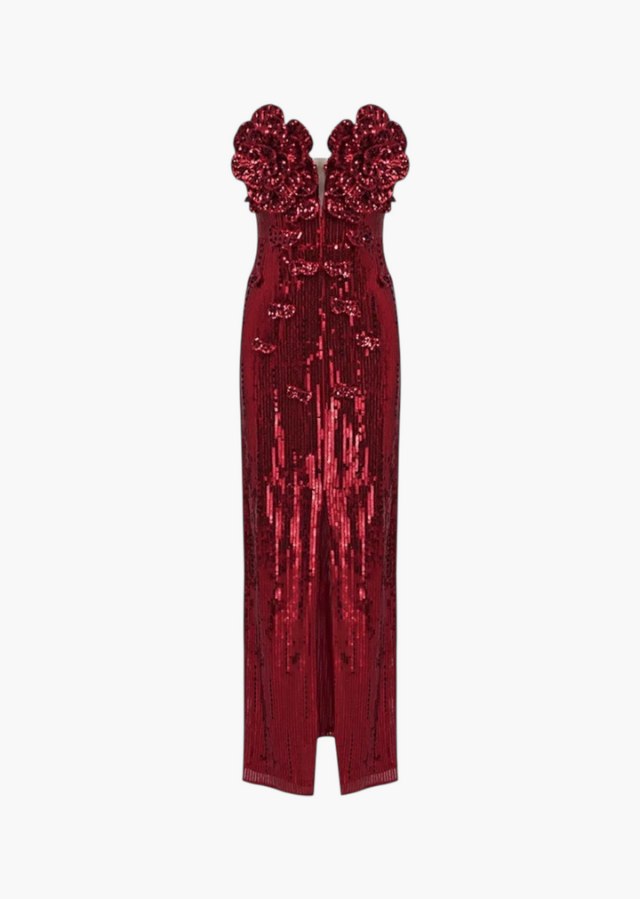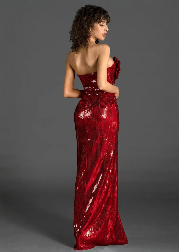 This glamorous gown features a strapless sweetheart neckline and oversized floral appliques on the bust. The entire dress is adorned with shimmering sequins, creating a stunning light-catching effect. A high thigh-slit adds movement and a touch of drama to the sleek, floor-length silhouette.
