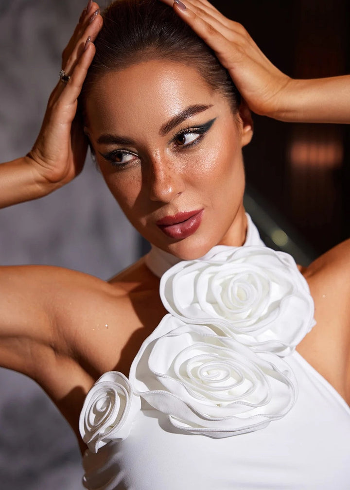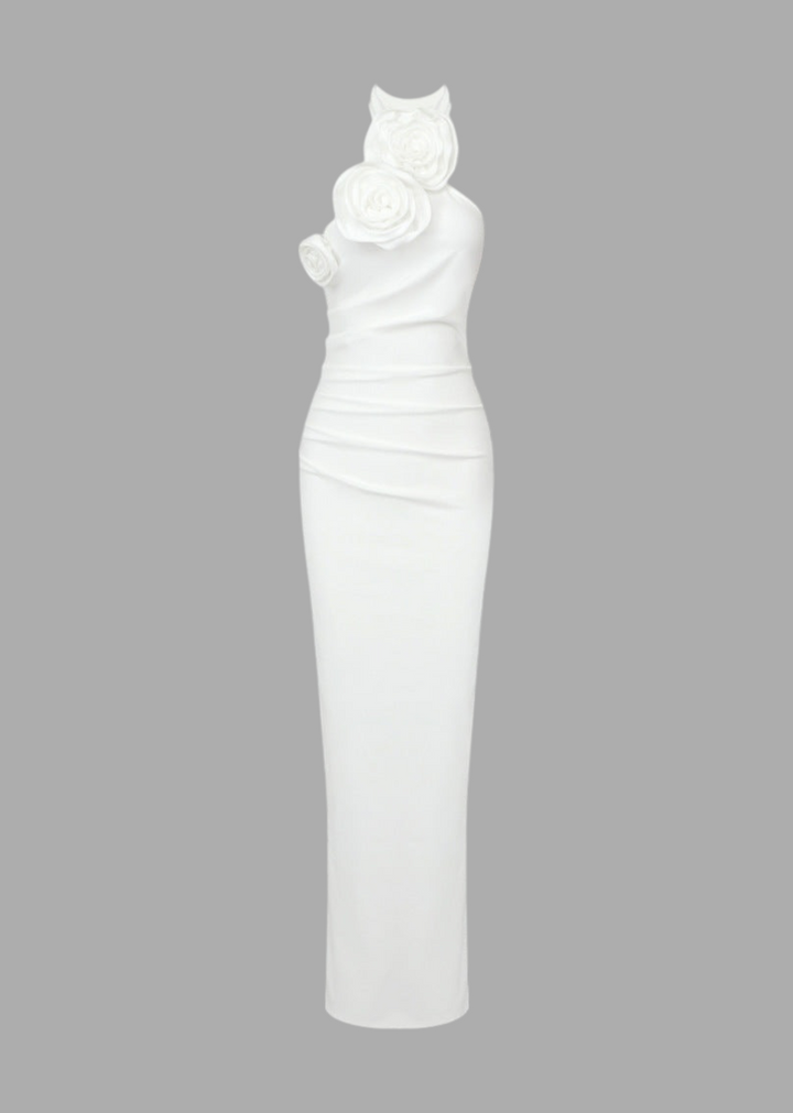 This elegant maxi dress showcases a halter neckline adorned with three-dimensional floral appliqués. The design features a ruched bodice for a flattering fit and a high slit on one side for ease of movement. The back of the dress has self-tie straps that create a decorative bow. The gown falls to a floor-length hem with a subtly flared silhouette.
