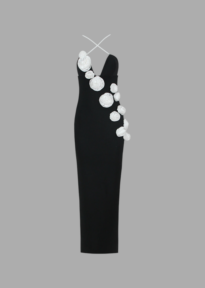 This elegant maxi dress features a sweetheart neckline and a body-hugging silhouette that extends to the floor. Delicate floral appliques cascade down one side of the dress from the neckline to the mid-thigh, creating a romantic and eye-catching detail. The straps are embellished with faux pearls, adding a touch of sophistication. The back of the dress features a low cut with crisscrossing pearl straps and a concealed zipper closure. A subtle back slit allows for ease of movement.