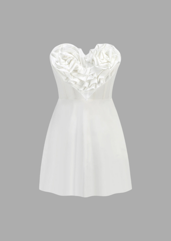 This dress features a strapless neckline and a structured bustier bodice. The front is adorned with a prominent, layered floral detail on the bust, sculpted into a heart shape. The back of the dress boasts a corset-style lacing, allowing for a customizable and flattering fit. It finishes with a sleek mini-length skirt.