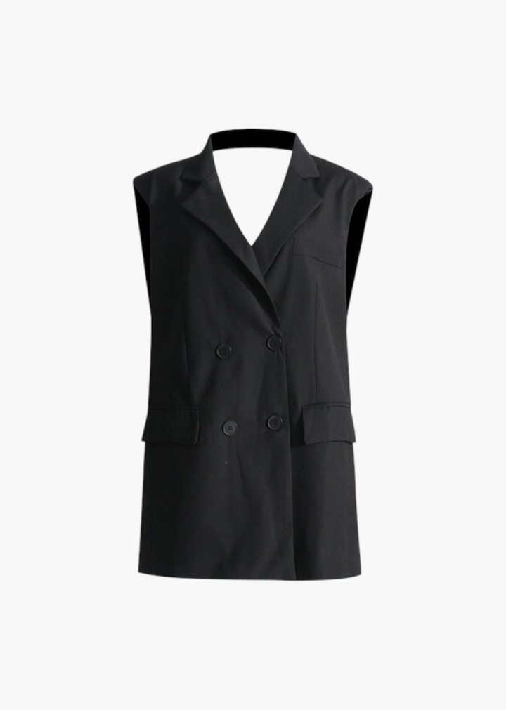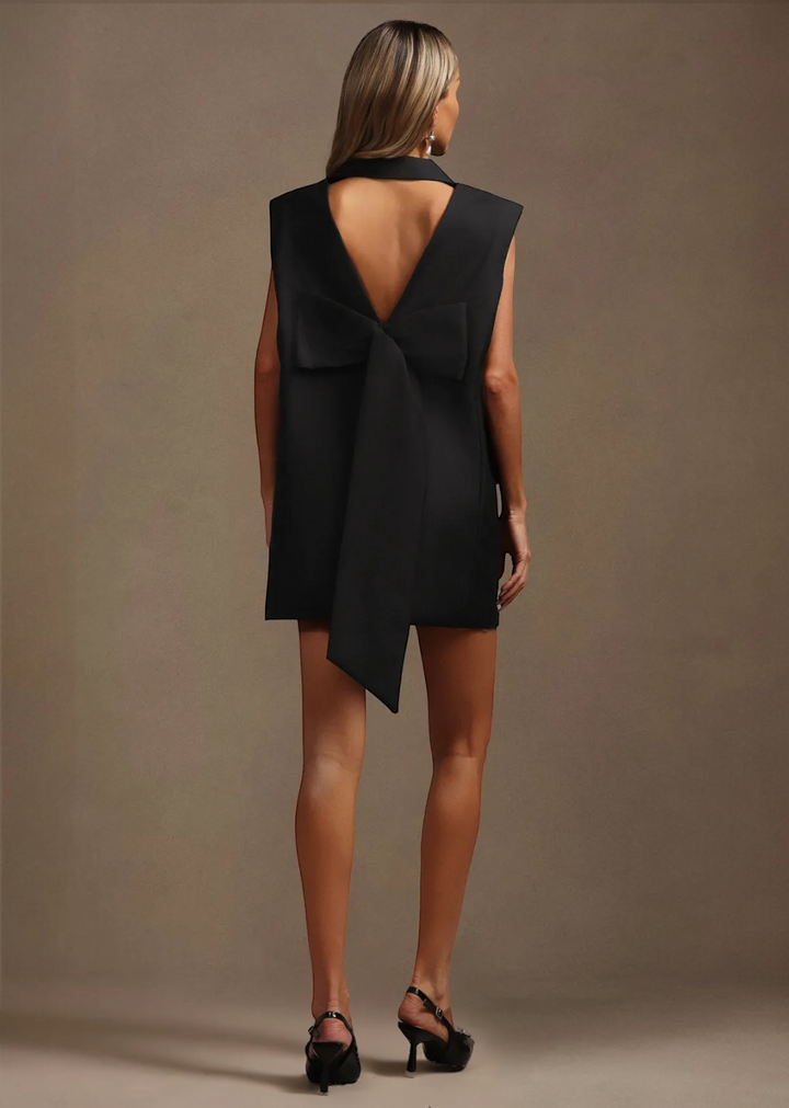 This unique mini dress blends the sophistication of a blazer with the playfulness of a short dress. It features a sharp lapel neckline and a sleeveless design, giving it a structured, tuxedo-inspired silhouette. The back showcases a dramatic, oversized bow detail, adding an unexpected touch of elegance and flair. This versatile piece is perfect for making a statement at cocktail parties or formal gatherings.