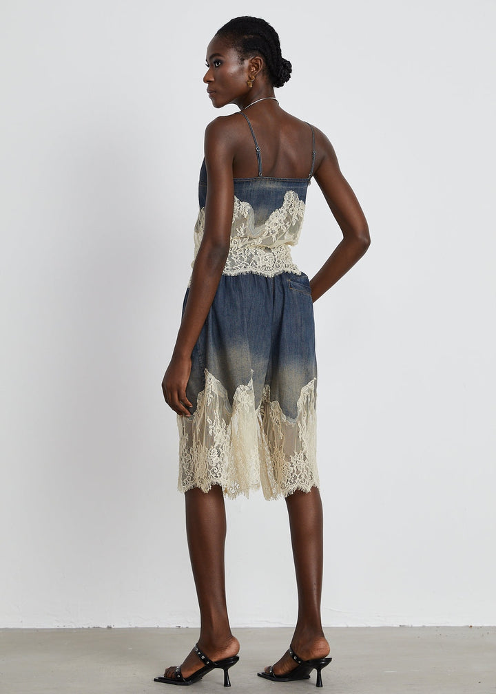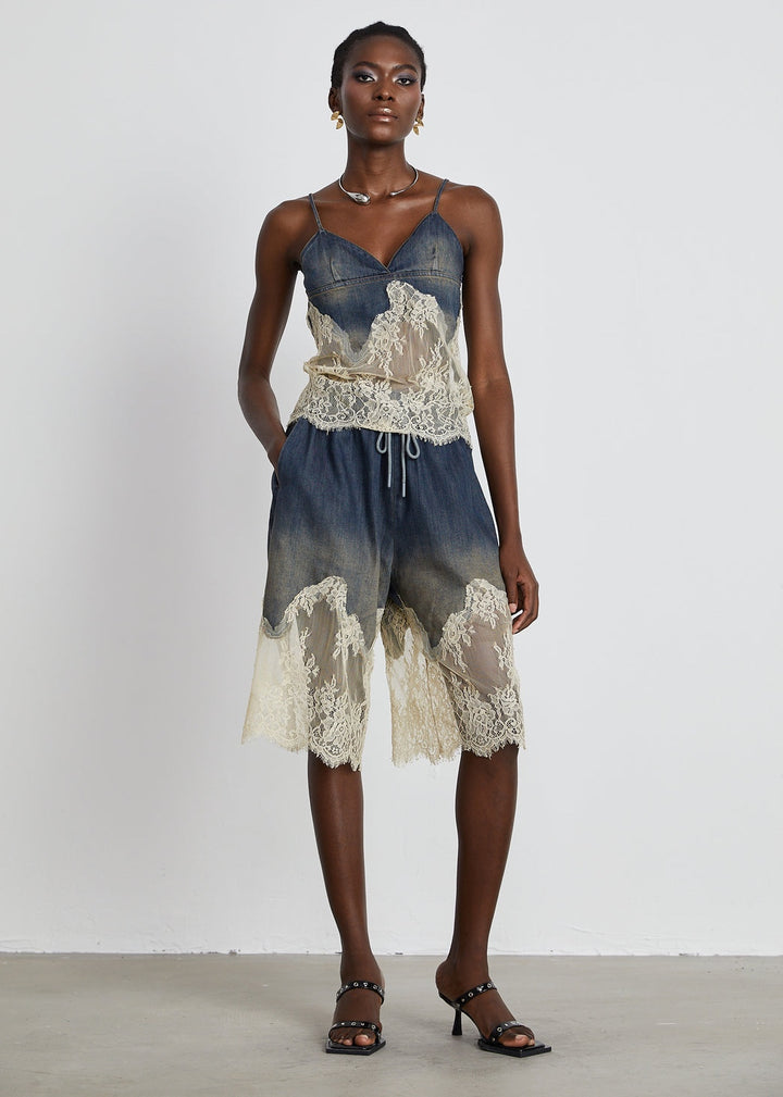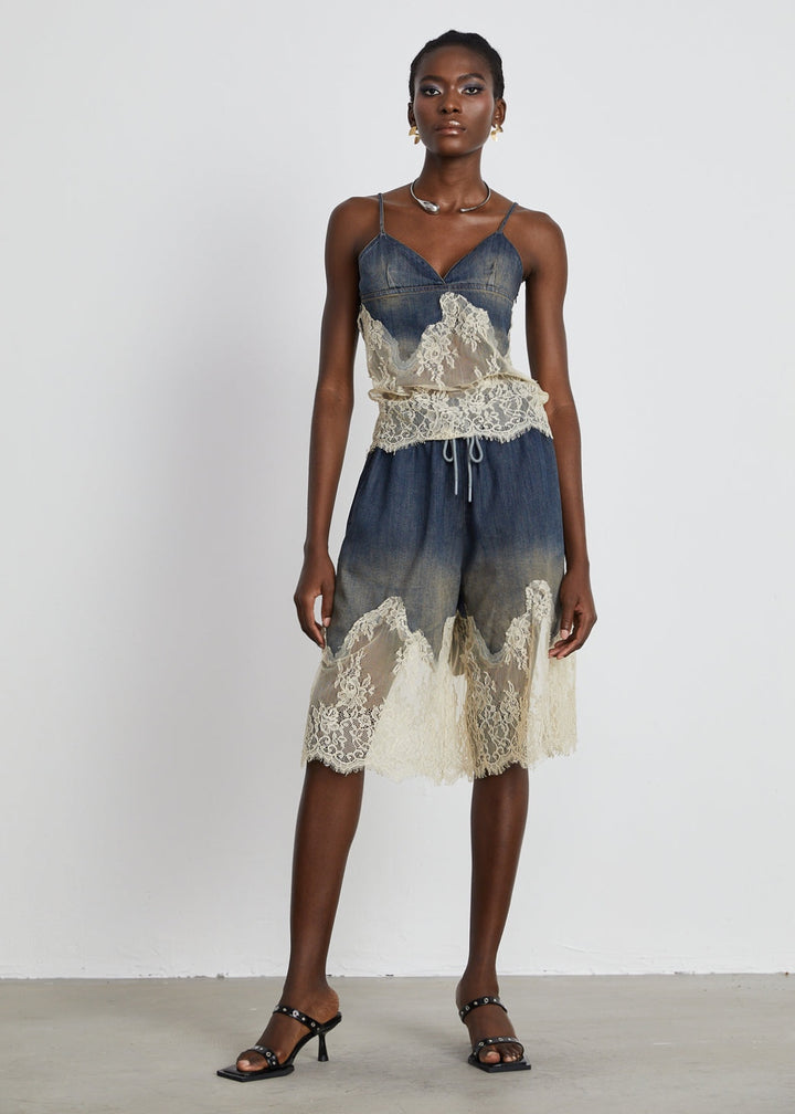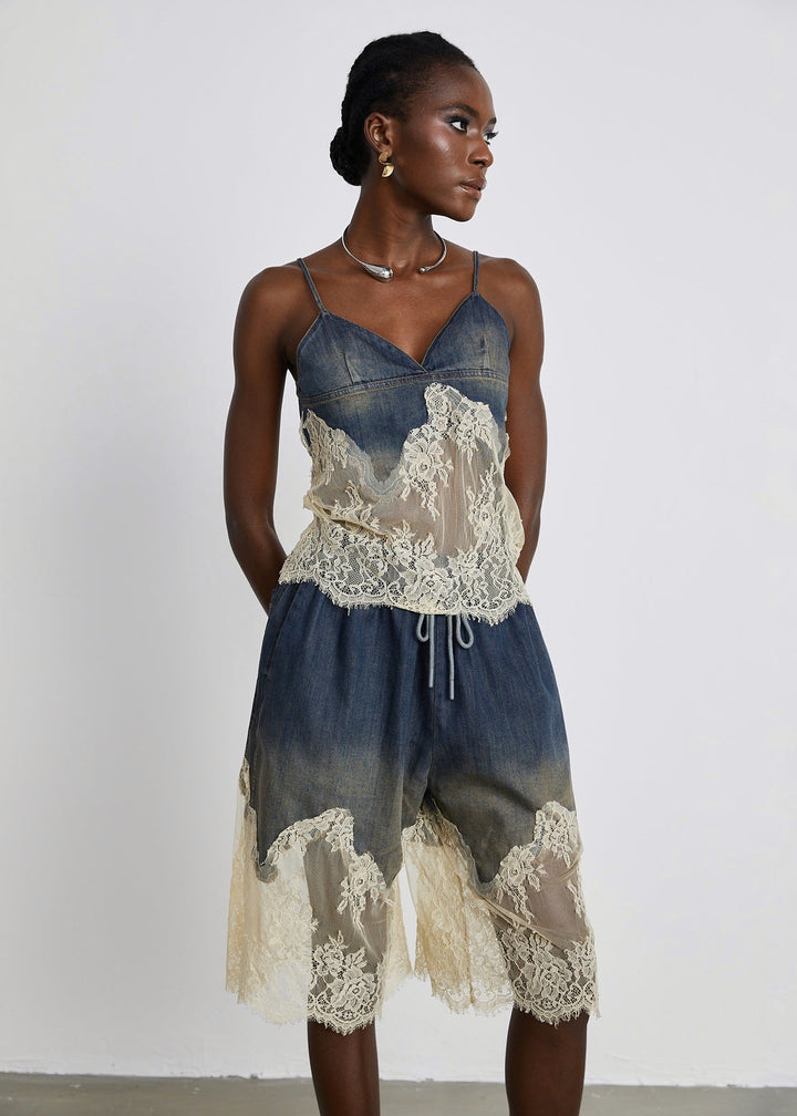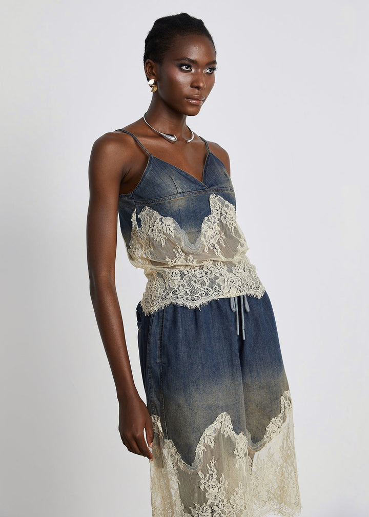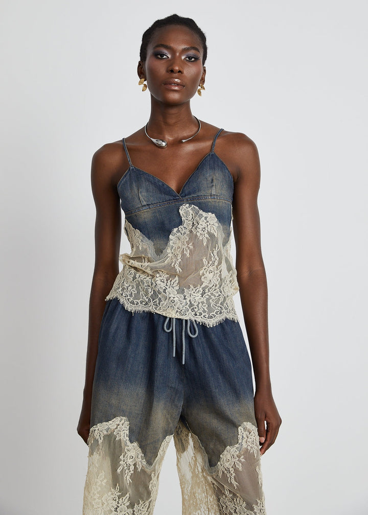 This top is a unique blend of casual and delicate elements, crafted from a washed denim-like fabric that creates an ombre effect, fading towards the bottom. It features a classic camisole silhouette with delicate spaghetti straps and a V-neckline. The standout detail is the intricate lace inset that forms the bodice, providing a beautiful contrast in texture and design. The lace extends down to create a tiered, layered effect, adding a feminine and bohemian touch. This top is perfect for creating a relaxed yet stylish look.