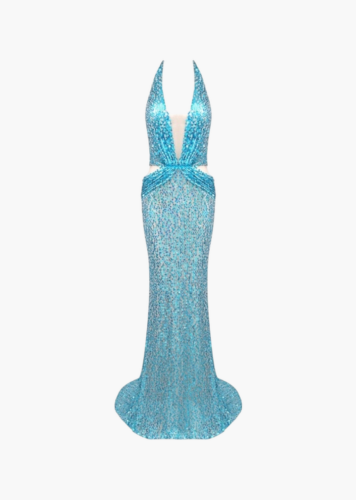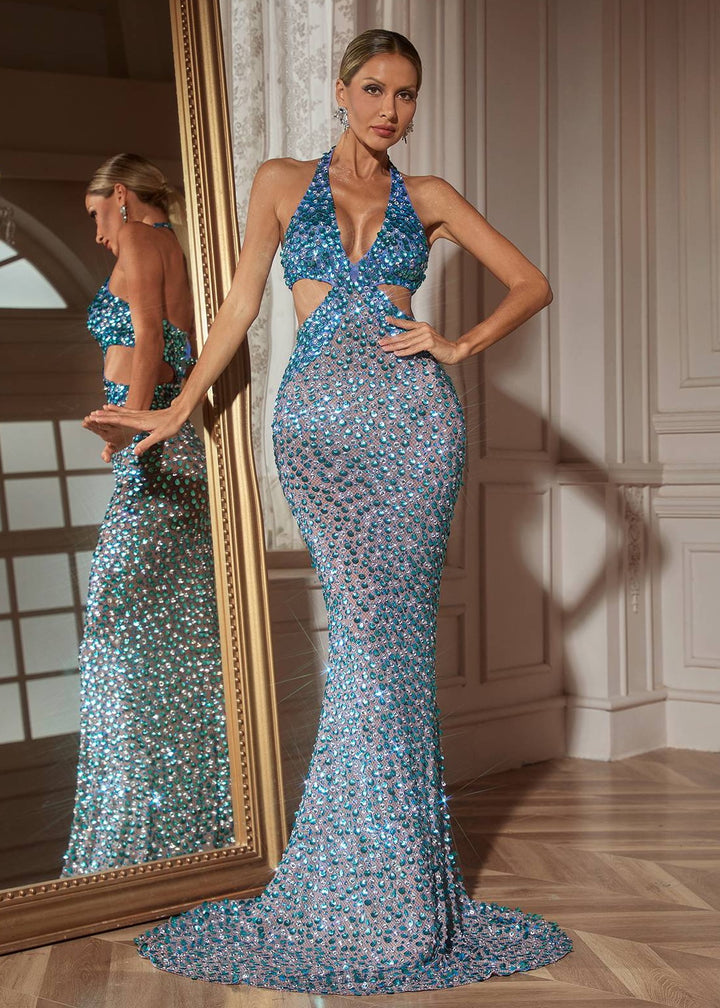 This mesmerizing gown is designed to shimmer and captivate at any formal event. Covered entirely in sparkling sequins, the dress features a sophisticated halter neckline that plunges into a deep V at the front. The bodice includes unique waist cutouts that accentuate the figure, while a daring open back adds a touch of drama. The gown flows into a figure-hugging silhouette that flares slightly at the hem, creating an elegant mermaid effect. The strategic cutouts and the all-over sequin embellishment make this dress a true statement piece, perfect for those who want to command attention and exude glamour.