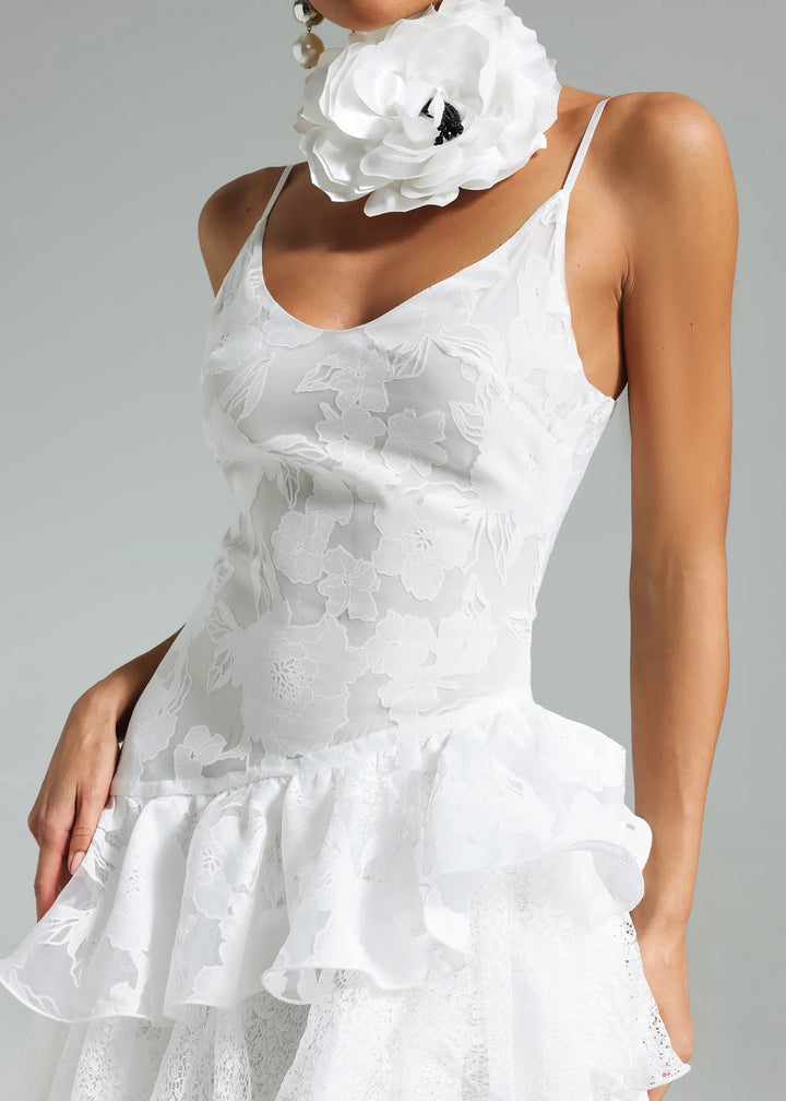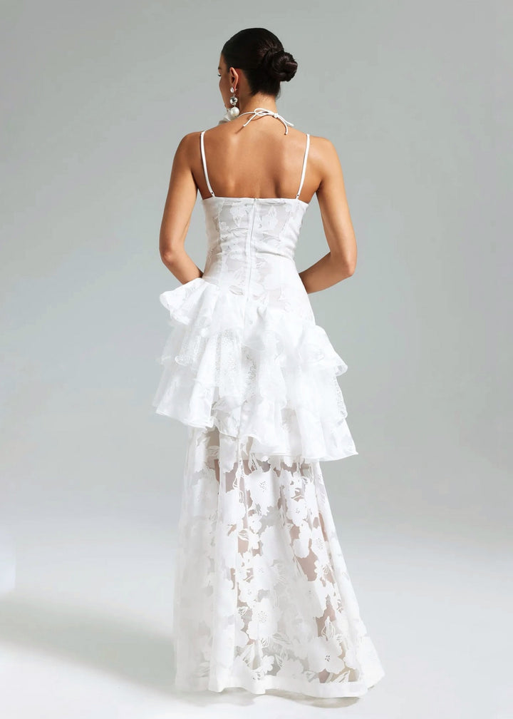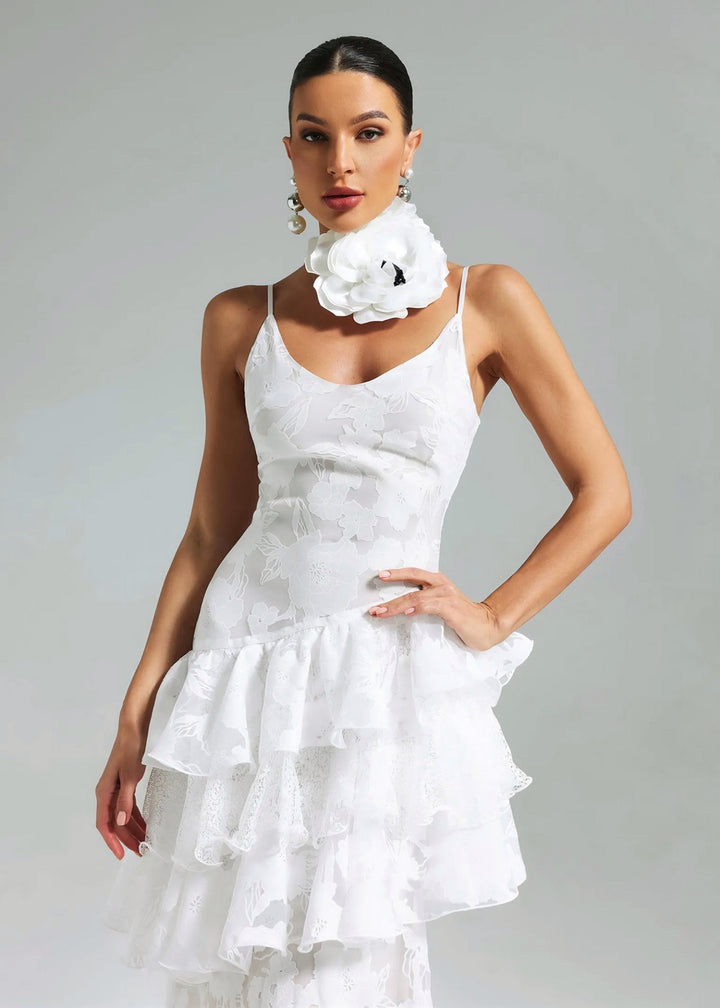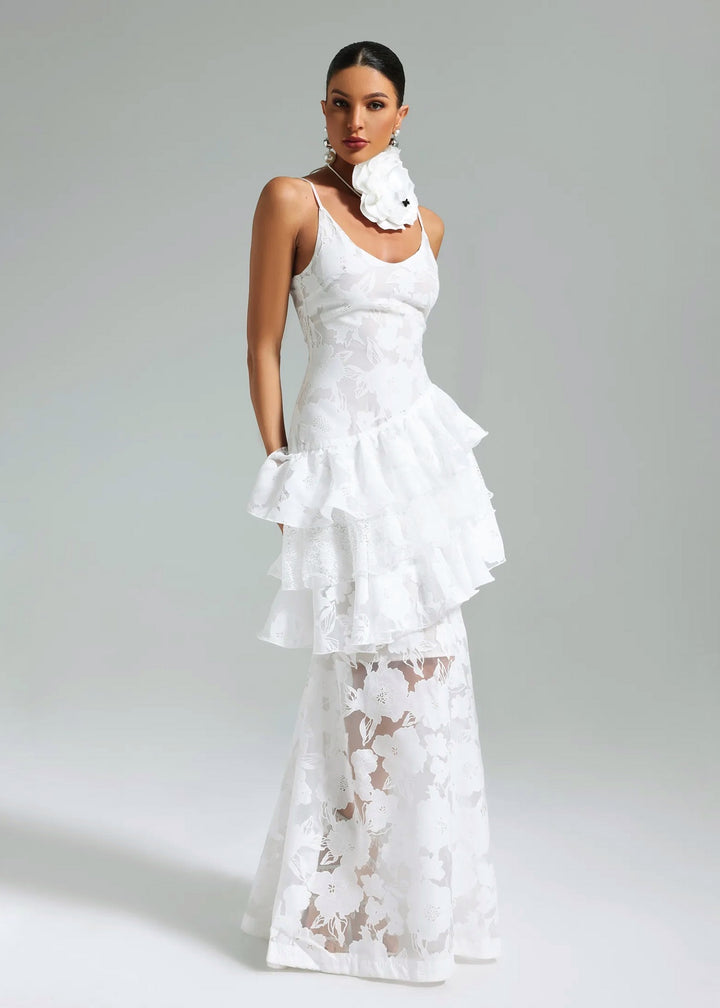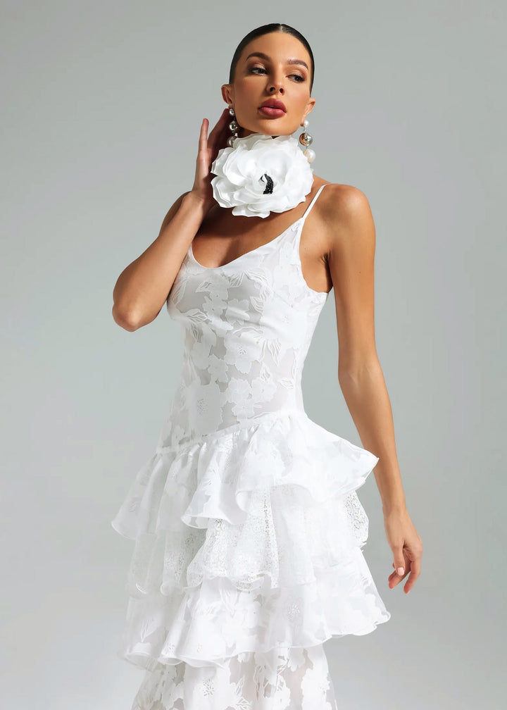 This gown is a vision of romantic sophistication, perfect for a wedding, garden party, or special occasion. It features a fitted bodice with delicate spaghetti straps and a graceful V-neckline. The dress is constructed from a structured, floral jacquard fabric that provides a subtle texture. The most striking elements are the tiered ruffles that create a dramatic, voluminous skirt, with the tiers starting just below the hips. This playful detail gives way to a floor-length hem, where the floral pattern becomes more prominent, showcasing the intricate lace-like texture of the fabrication. An optional, oversized three-dimensional flower choker collar adds a unique and modern twist to the ensemble.
