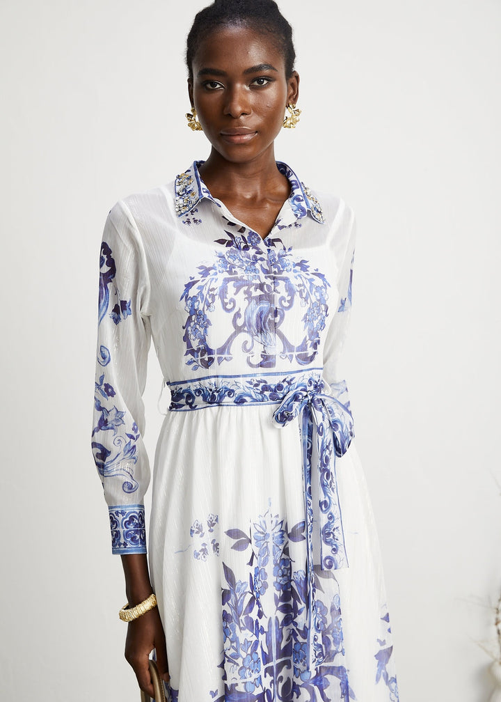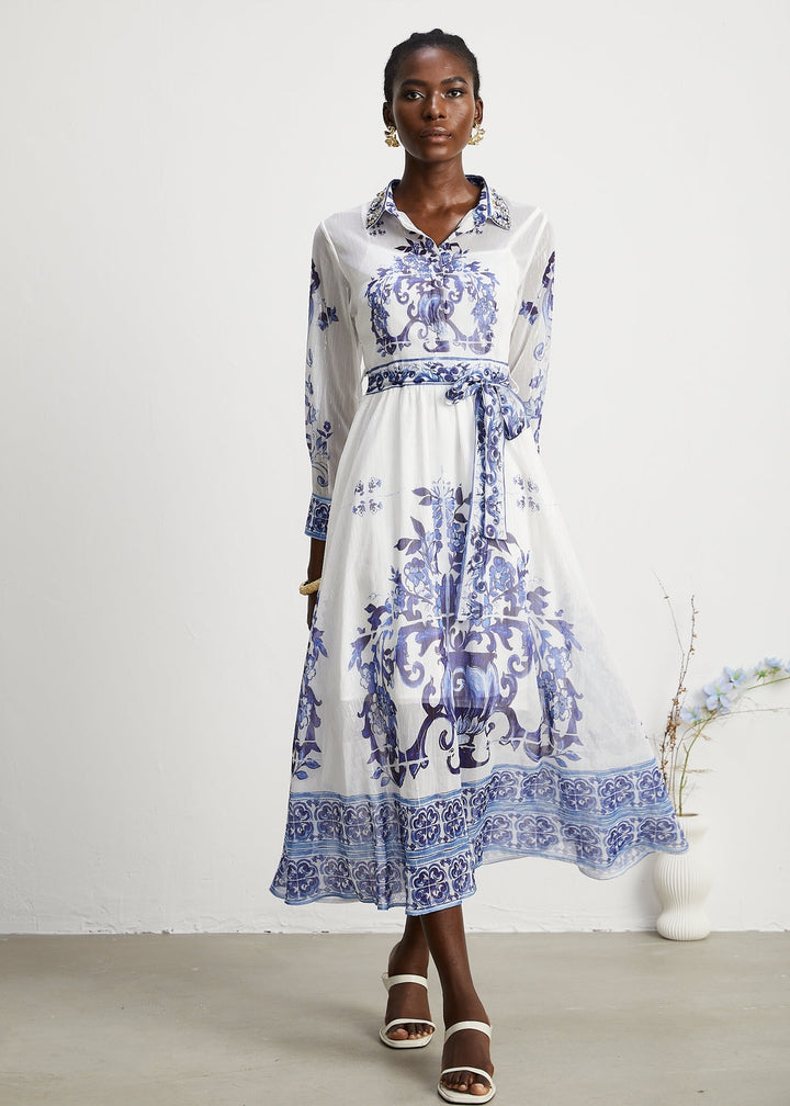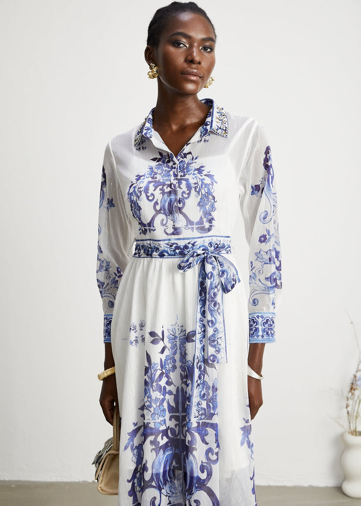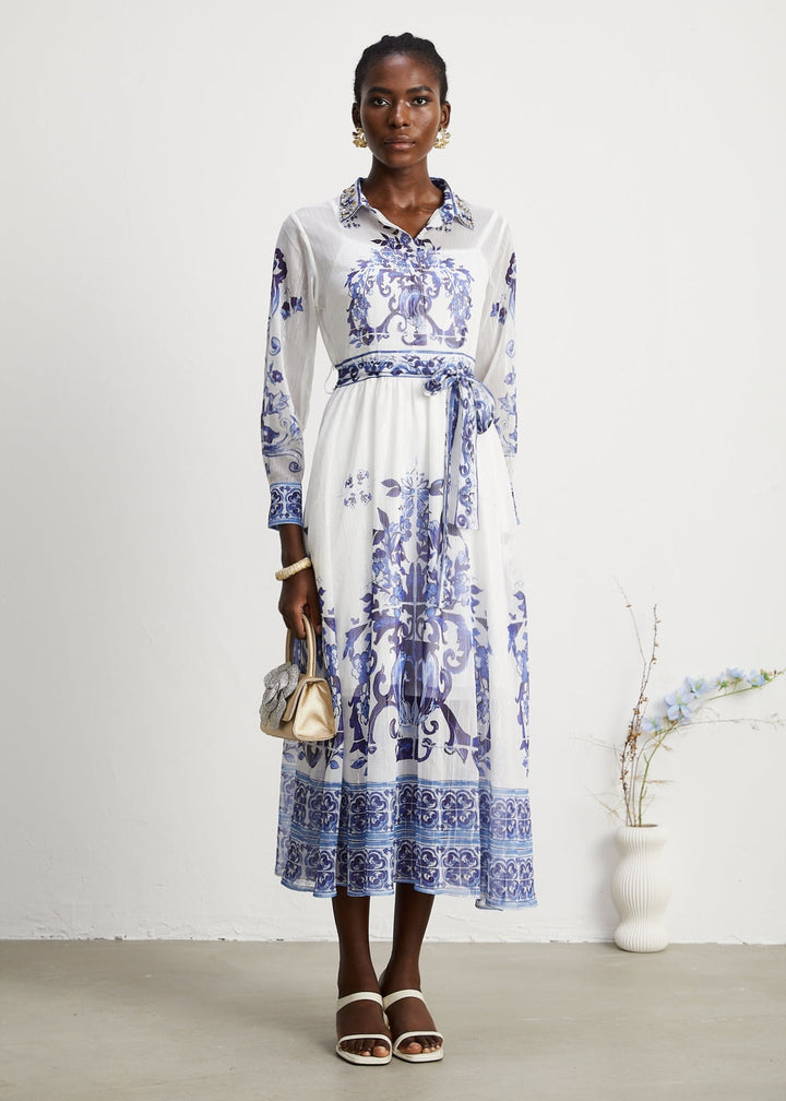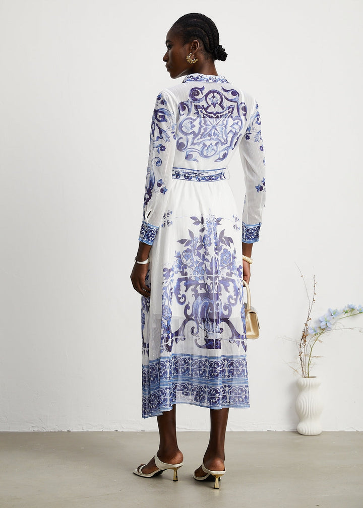 This elegant midi dress features a striking all-over tile-inspired print, reminiscent of classic pottery designs. It boasts a refined collared neckline and long sleeves, making it a versatile piece for various occasions. The dress is designed with a fitted bodice that flows into a gently flared midi skirt. A matching fabric belt cinches the waist, creating a flattering silhouette. The lightweight fabric ensures comfort and graceful movement. Button-down front closure allows for adjustable styling.