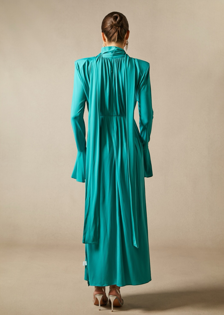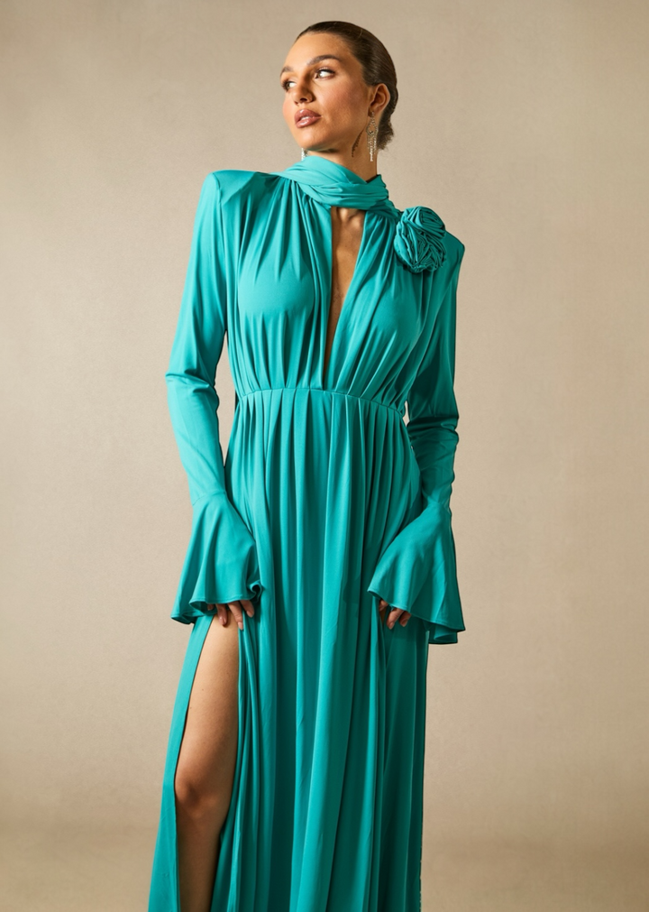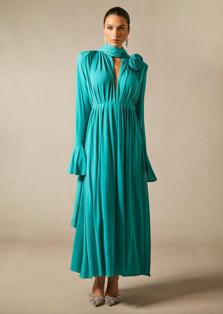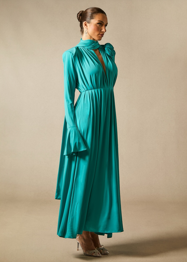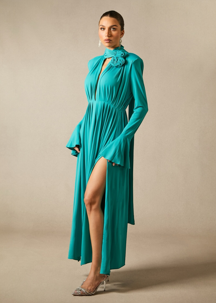 This long dress features a high-neck keyhole neckline with a draped detail and a 3D flower appliqué at the shoulder. The long, bell-sleeved silhouette is cinched at the waist with an elastic band, leading to a gracefully draped skirt with a high slit.