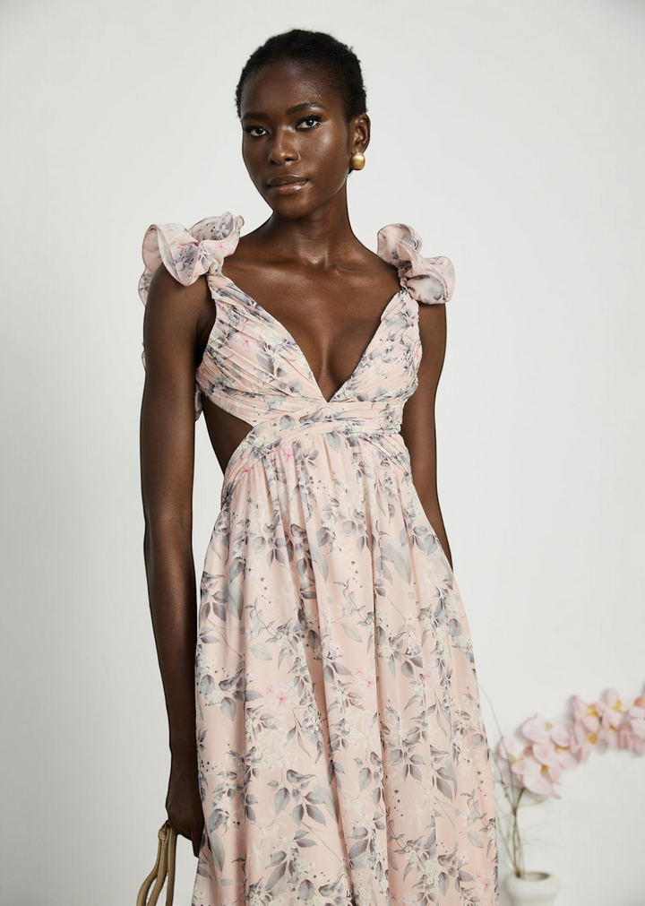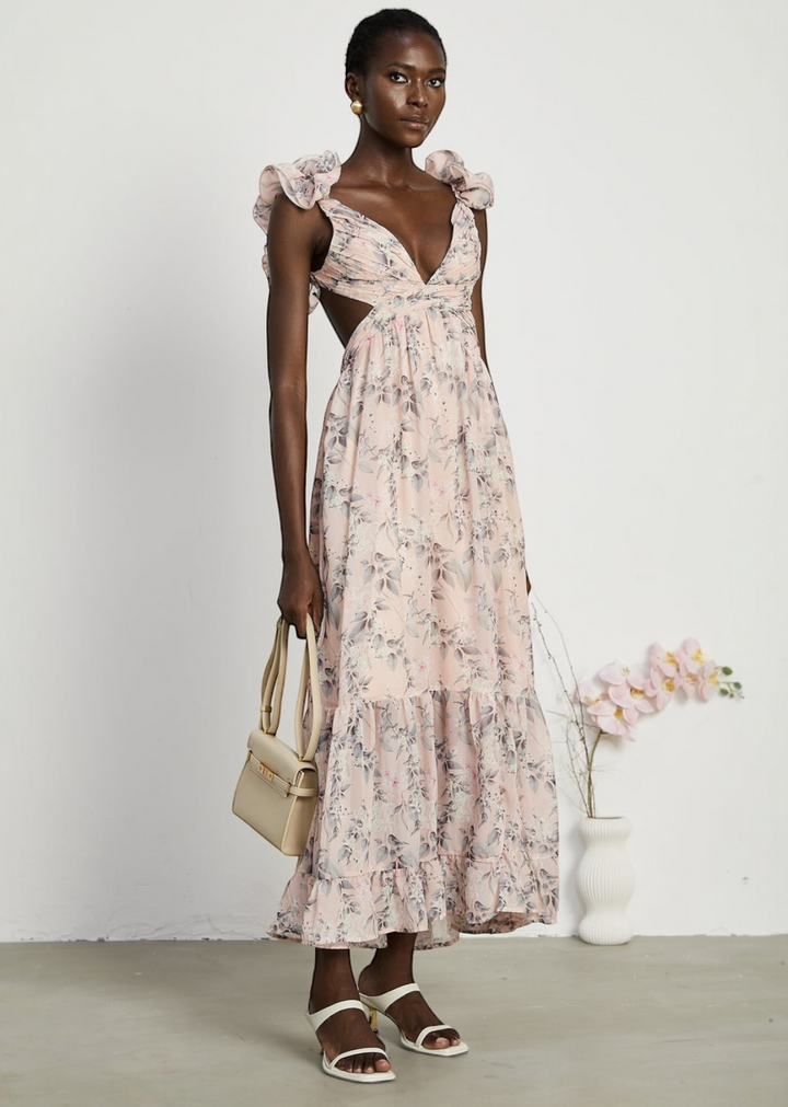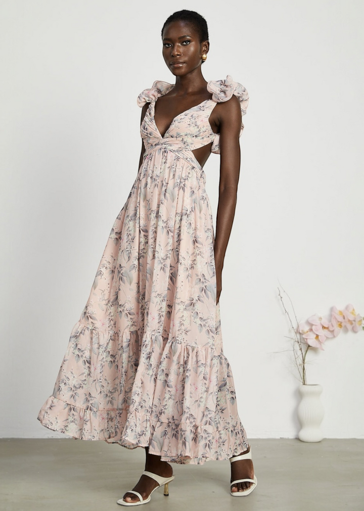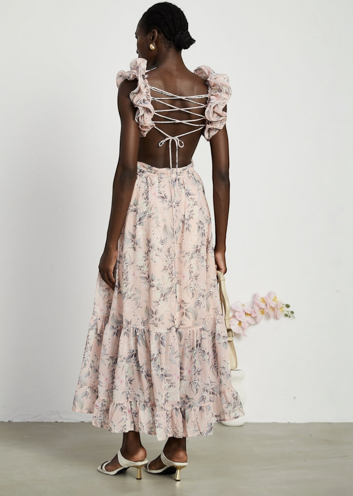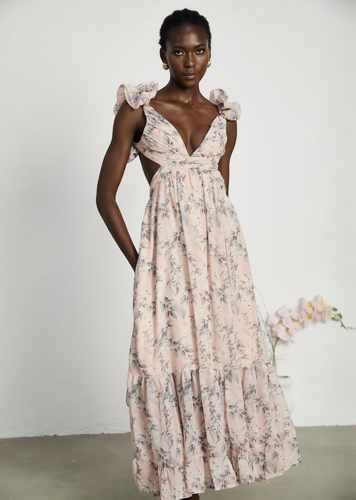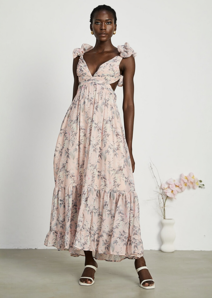 This flowing maxi dress showcases a delicate floral print throughout. It features a flattering V-neckline and unique shoulder straps adorned with soft ruffles. The dress also includes stylish cut-outs at the sides of the waist and an adjustable lace-up detail at the back, allowing for a customized fit. The skirt is tiered, adding volume and movement to the overall design.