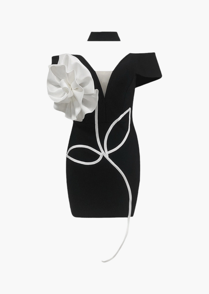 This mini dress is a captivating piece designed to make a statement. It features an off-shoulder neckline that elegantly frames the décolletage, paired with a distinct choker detail at the neck. The dress boasts a structured, fitted silhouette that accentuates the figure. A prominent, three-dimensional flower appliqué is strategically placed on the front, adding a sculptural and artistic element to the design. The dress is crafted from a smooth, substantial fabric, ensuring a sophisticated drape and fit.