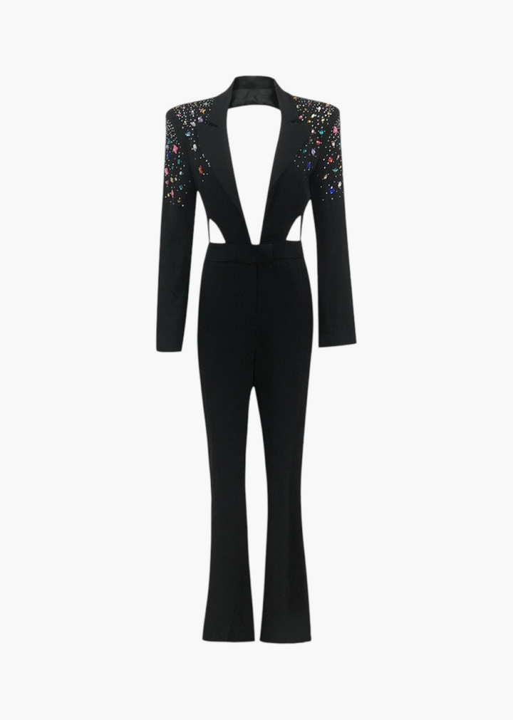 This sophisticated jumpsuit is designed with a tailored blazer-style top featuring a plunging V-neckline and a lapel collar. The shoulders and upper back are heavily adorned with multi-colored rhinestone and bead embellishments. It features dramatic side cutouts at the waist and a striking open back design. The lower half consists of long sleeves and flared, wide-leg trousers.