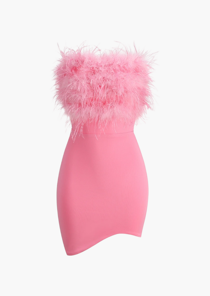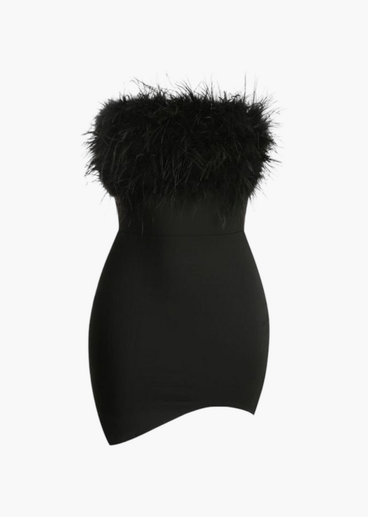 This dress is a show-stopping piece, perfect for making an entrance at your next event. The design features a bandeau neckline adorned with a plush feather trim, creating a statement bodice. The bodycon silhouette hugs your curves, while the asymmetric hemline adds a playful and modern twist. Crafted from a comfortable fabric with a slight stretch, this mini dress is both stylish and easy to wear.
