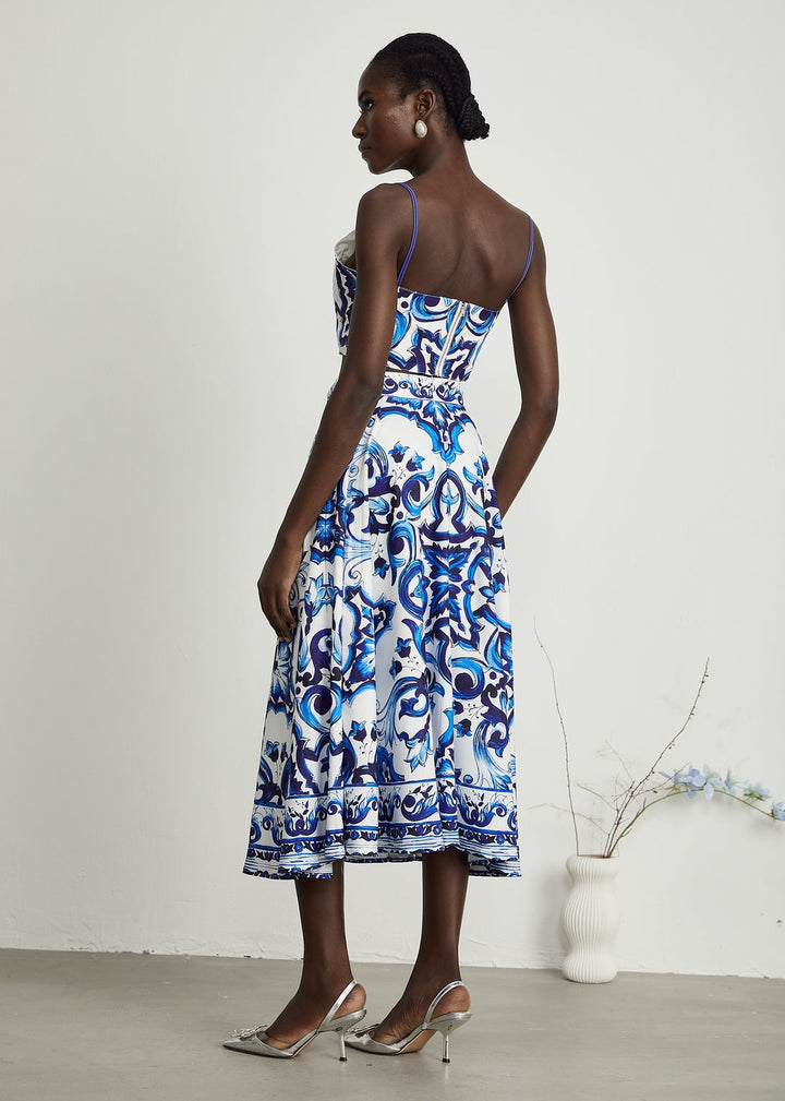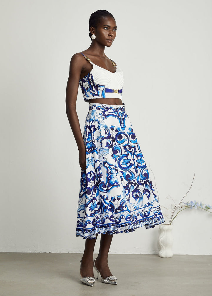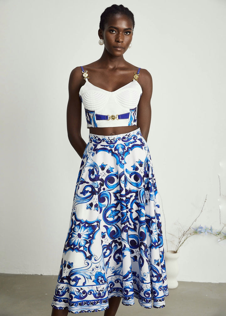 This striking two-piece set features a vibrant, all-over printed midi skirt paired with a structured crop top. The skirt boasts a flattering flared silhouette that moves beautifully. The crop top has a unique design with thin shoulder straps and a defined, structured bodice. A decorative belt detail with a metallic buckle accentuates the waistline of the top. This set offers a modern and chic look, perfect for warm weather events or stylish outings.