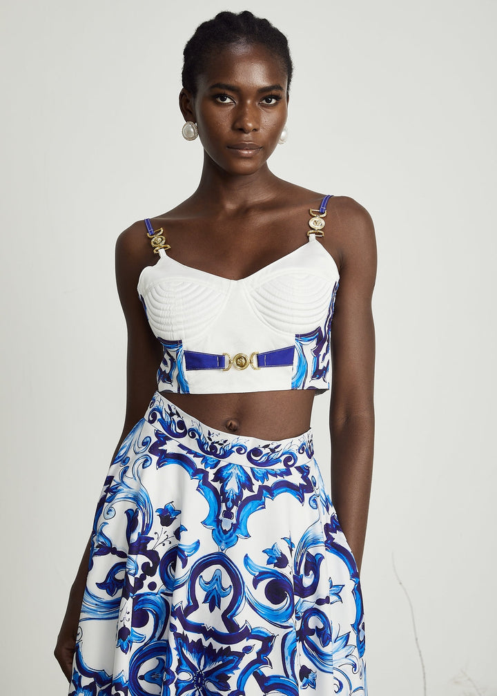 The crop top can be paired with high-waisted trousers or a solid-colored midi skirt for alternative outfits.