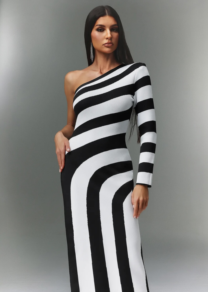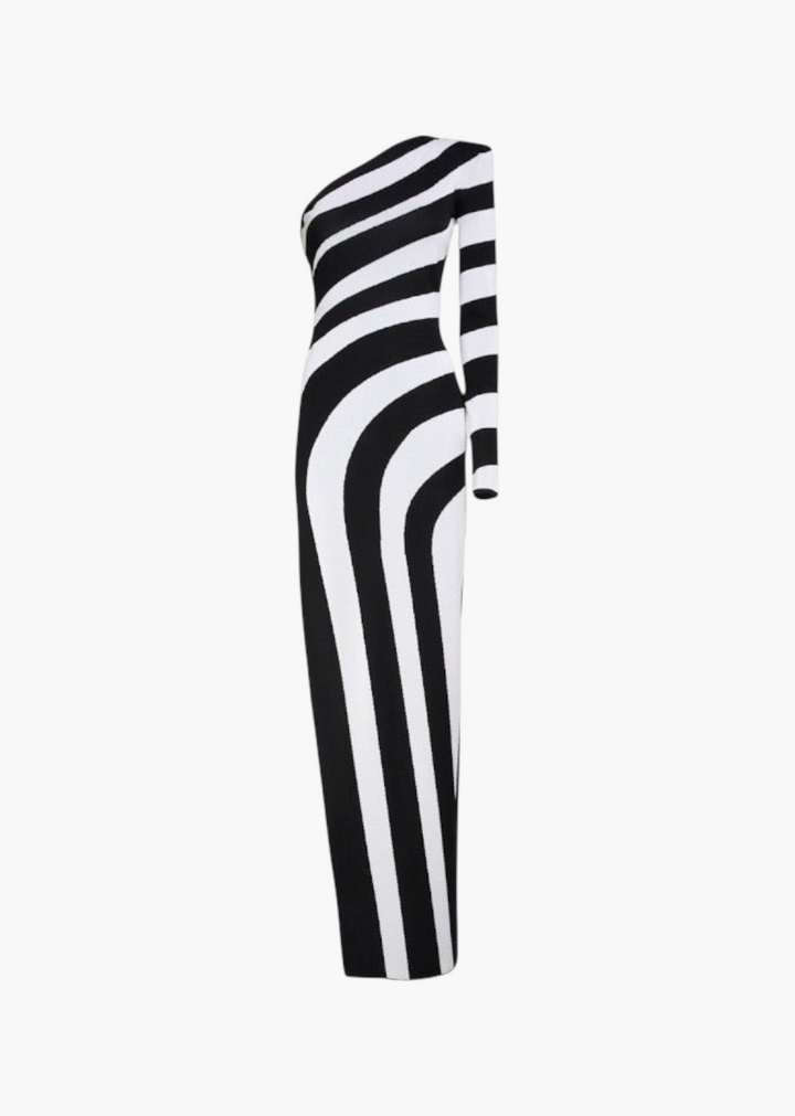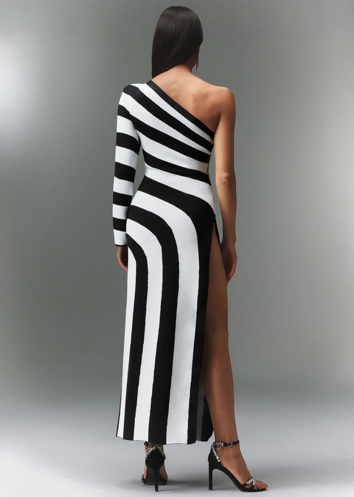 This maxi dress features a bold one-shoulder design with a single long sleeve. The body-skimming silhouette is defined by a striking graphic stripe pattern. A high-cut thigh slit adds a dramatic and alluring element, making this a modern and dynamic statement piece.