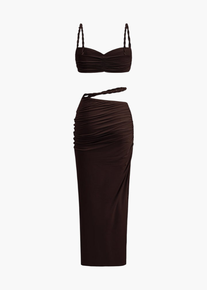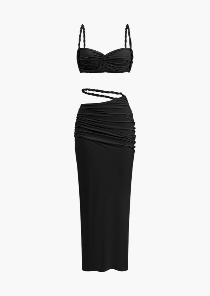 This two-piece set features a ruched bandeau top and a long skirt joined visually by a braided waist detail. The top has double braided straps and gathered ruching across the bust for shape and support, while the skirt offers side ruching and a low hip cutout finished with the same braided trim. The construction is designed for close drape and streamlined silhouette with stretch for comfort and movement.