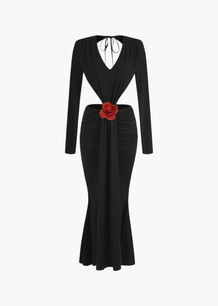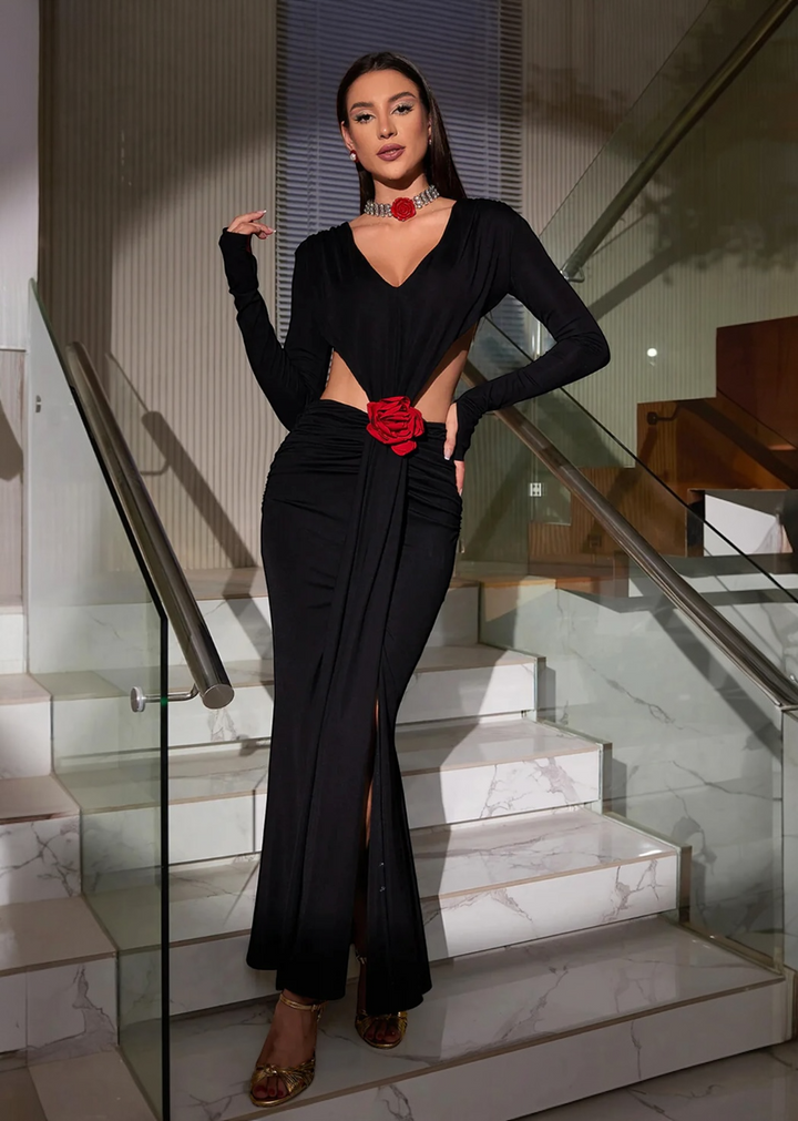 This floor-length gown features a striking backless design with a tie closure at the neck. The front is defined by waist cutouts and a dramatic rose detail at the center, flowing into a high slit. The fabric drapes elegantly, creating a sleek and sophisticated silhouette. This dress is a standout choice for formal events and gala nights.