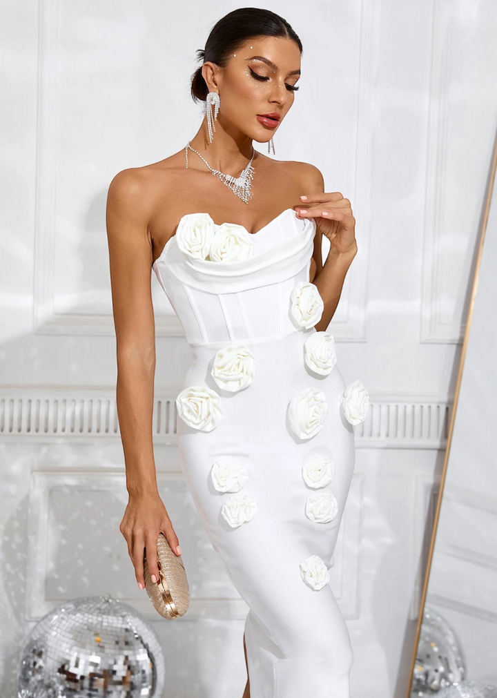 This sophisticated maxi dress is a glamorous choice for formal events. It is a bandage-style dress which provides a figure-hugging, sculpted silhouette. The design features a strapless, sweetheart neckline on a structured bodice. It is embellished with strategically placed 3D rose appliques along the front. The skirt is finished with a back split hem, allowing for ease of movement and adding a touch of elegance.