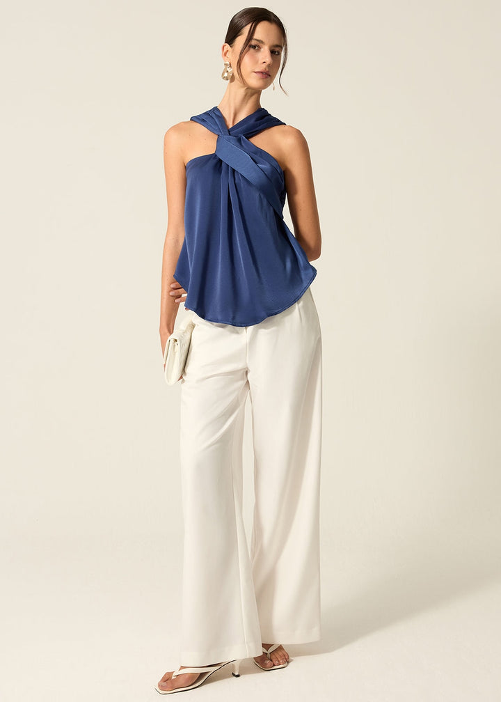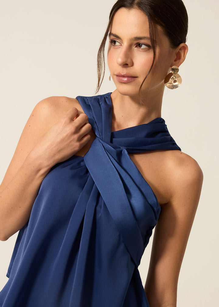 A modern sleeveless top featuring a twisted halter neck that forms a central knot and continuous draped panels across the bust. The body falls from soft pleats into a gently curved hem for an easy, wearable silhouette. A discreet center-back zipper secures the fit while keeping the back clean and simple. Cut to pair under blazers or worn alone for evening and daytime looks.