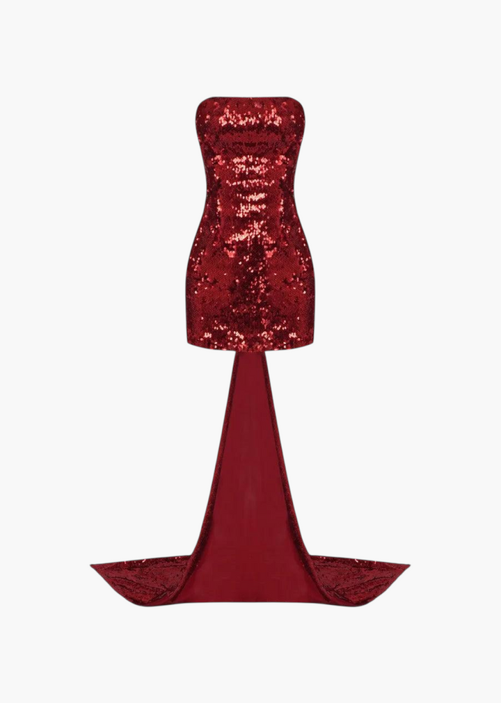 This striking mini dress features a strapless neckline and a fitted silhouette fully embellished with shimmering sequins. A dramatic, flowing train is attached at the back, adding an element of sophisticated glamour. The dress is designed to make a statement and is perfect for special occasions where you want to stand out.