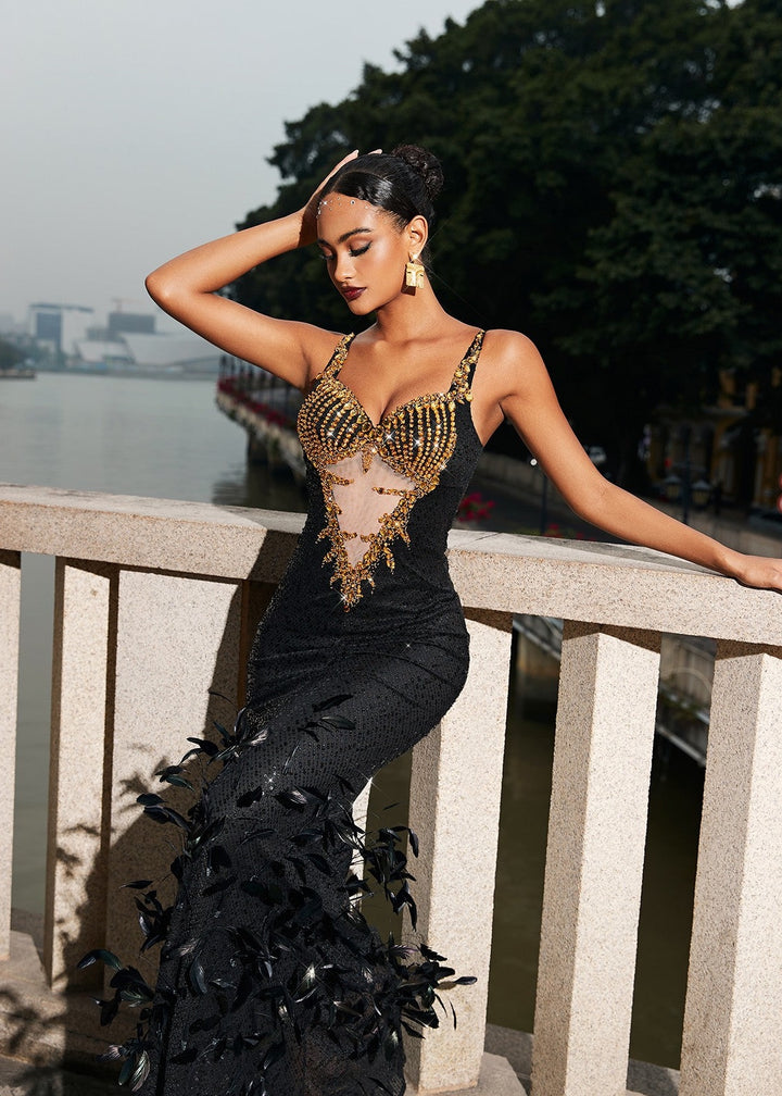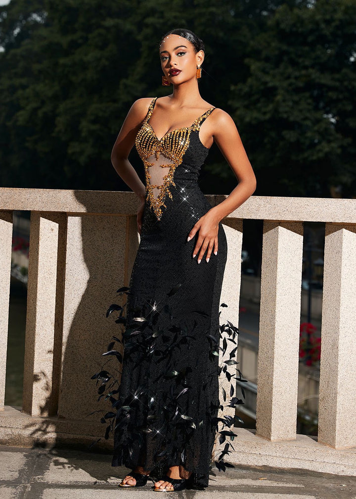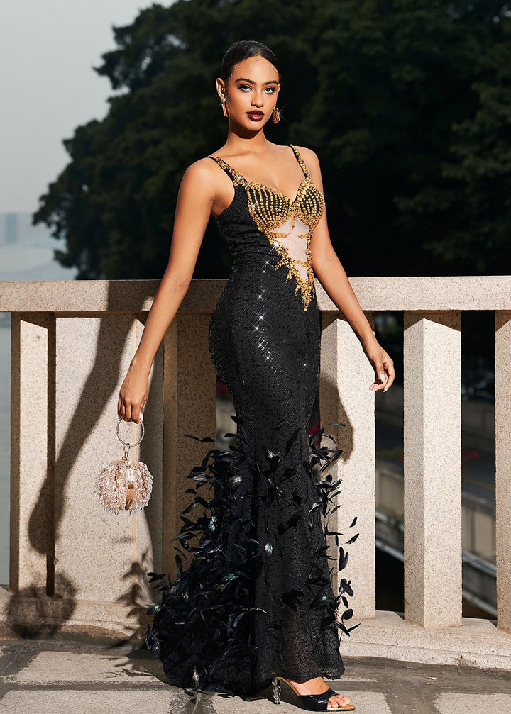 This stunning long gown is designed for a dramatic entrance. It features a sweetheart neckline with a sheer mesh and gold beaded bustier bodice. The form-fitting silhouette is covered in sequins, leading to a mermaid-style skirt with cascading feather accents. A hidden back zipper ensures a seamless fit. This dress is perfect for formal events, gala, and red carpet events.