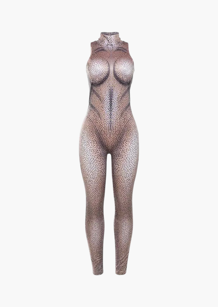 This jumpsuit is a daring and glamorous piece designed to make a memorable statement. It features a body-hugging, one-piece silhouette with a high neck and long sleeves. The most prominent feature is the sheer, mesh-like fabric that is covered entirely with sparkling rhinestone embellishments. These rhinestones are arranged in a dense, all-over pattern, creating a dazzling effect. The jumpsuit has a back zipper closure and a mock-neckline, offering a sleek and contemporary fit.