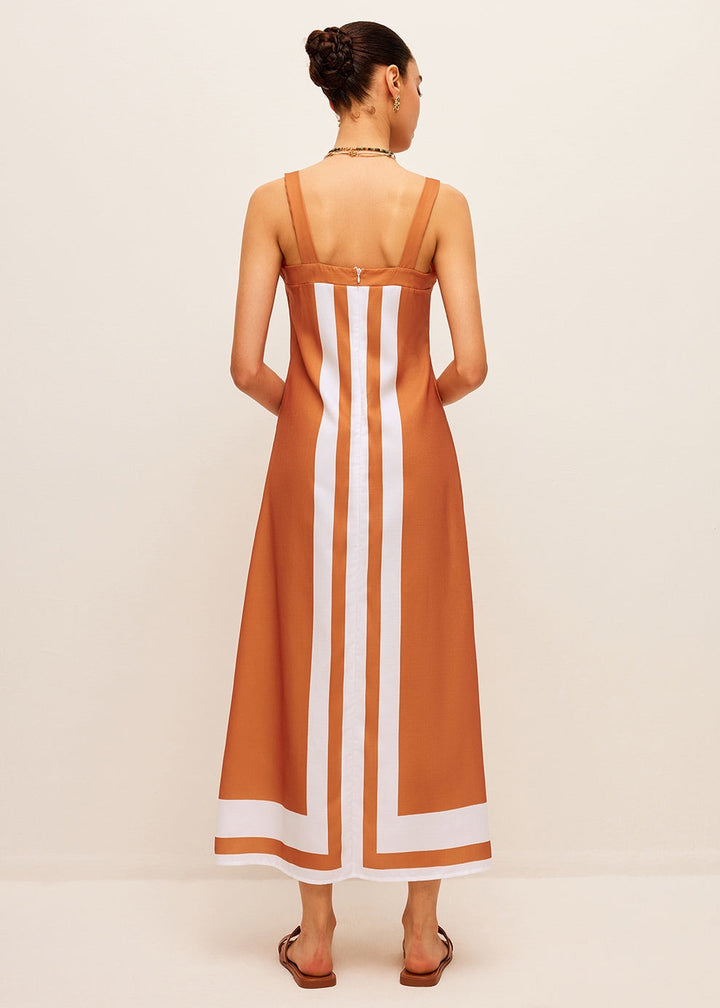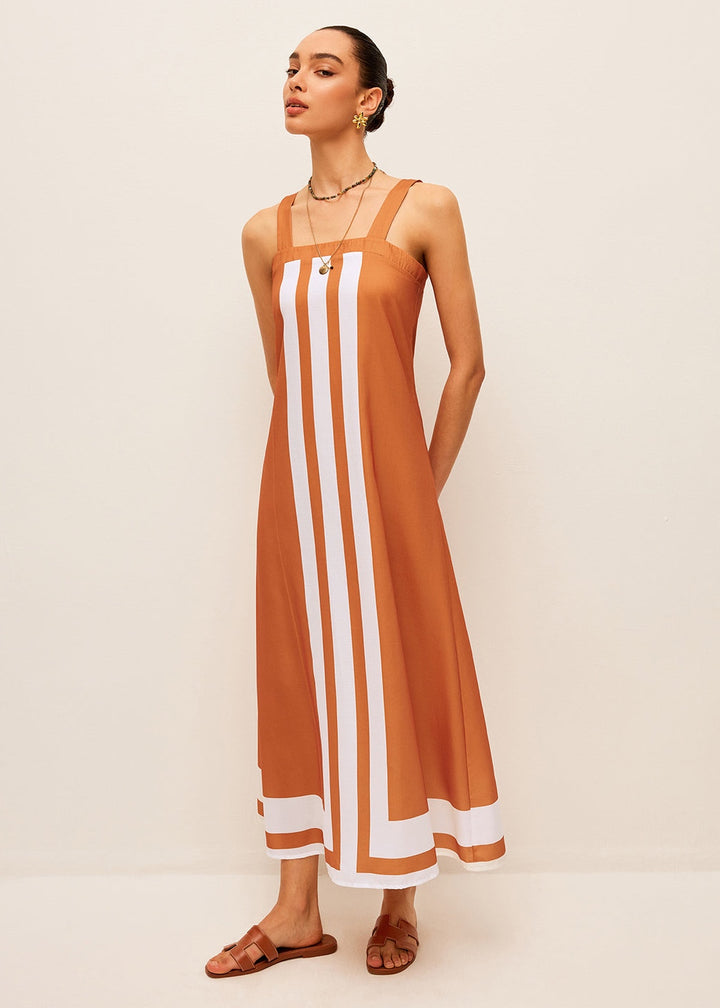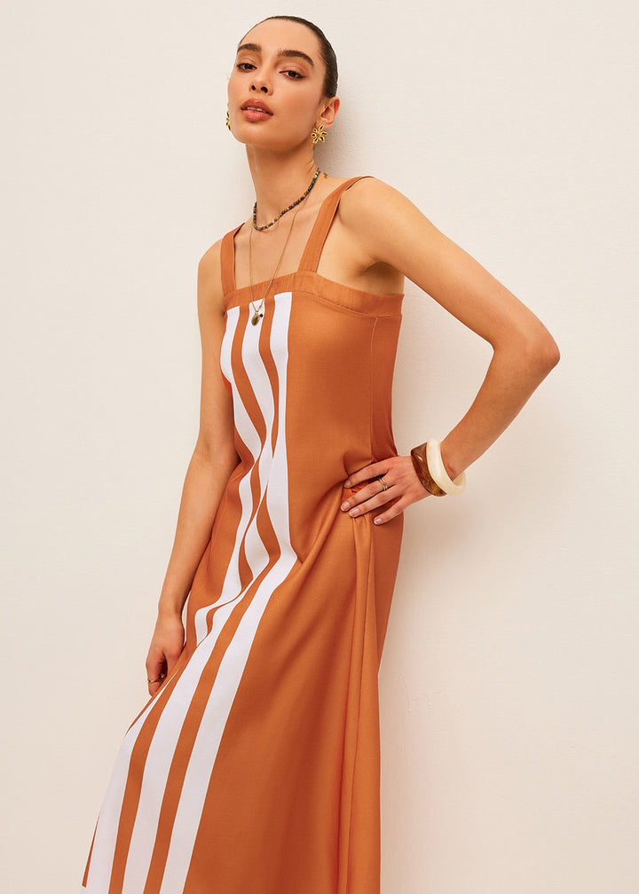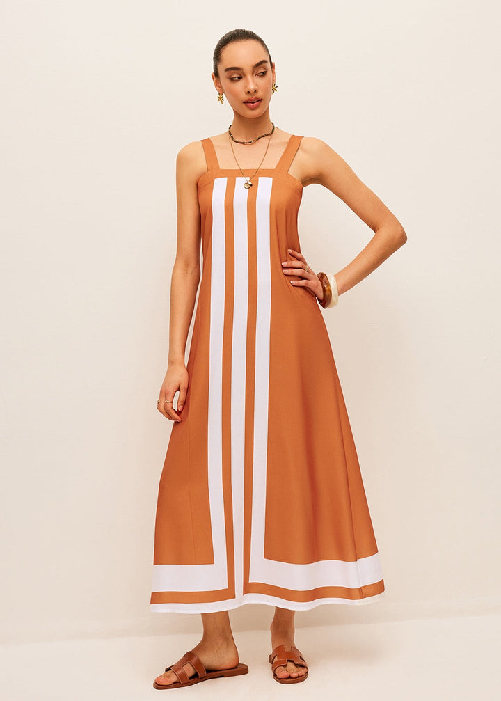 This elegant A-line maxi dress is a perfect addition to your warm-weather wardrobe. The dress features a structured bodice with thin, adjustable shoulder straps that provide a comfortable and secure fit. A standout feature is the bold, geometric pattern composed of parallel vertical stripes that run down the front of the garment, transitioning into a horizontal border at the hem. The dress is crafted from a lightweight, breathable fabric that drapes beautifully, creating a full and flowing skirt that moves with you.