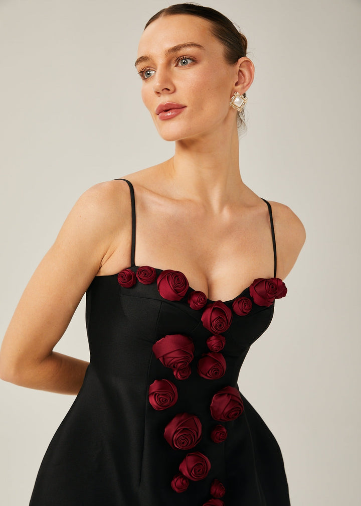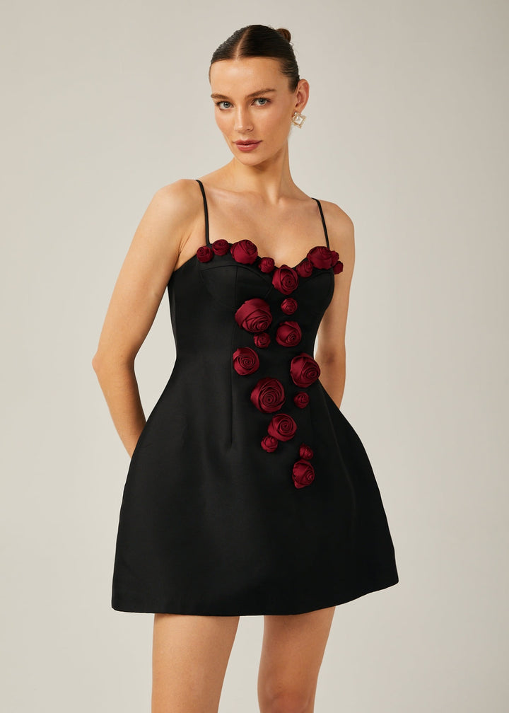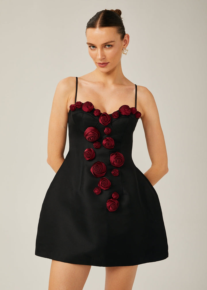 This enchanting mini dress features a sleek silhouette that flatters the figure. The bodice is adorned with meticulously crafted satin rosette appliqués cascading down the front, creating a romantic and sophisticated aesthetic. Designed with delicate spaghetti straps, this dress exudes timeless elegance, making it an ideal choice for special occasions.