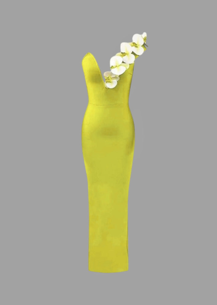This gown is a masterpiece of modern elegance, designed for a formal event or red-carpet occasion. It features a one-shoulder silhouette with a sculptural, oversized floral applique on the shoulder strap, adding a touch of romance and drama. The dress has a deep V-neckline with a mesh panel insert for a sophisticated and secure fit. The body is fitted and draped to accentuate the figure, flowing down to a full-length skirt with a high front slit. A central back zipper closure ensures a seamless fit. This gown combines a classic silhouette with contemporary detailing, making it a truly unique statement piece.