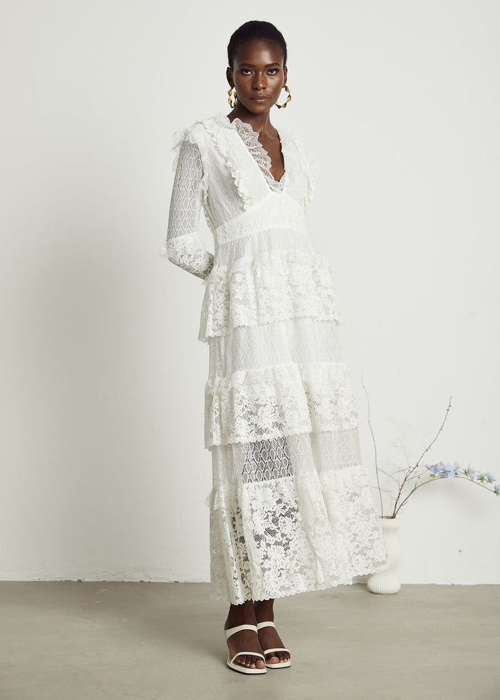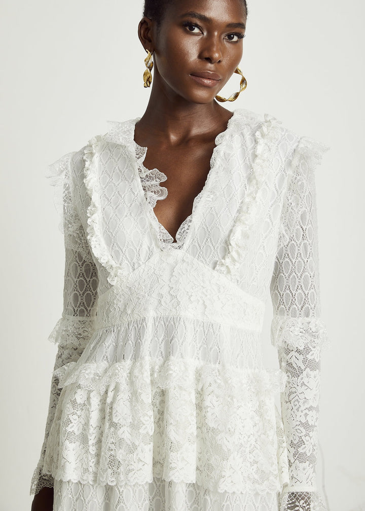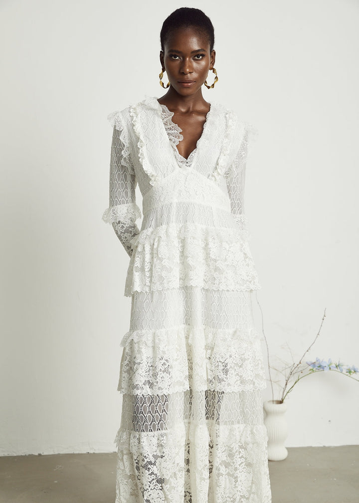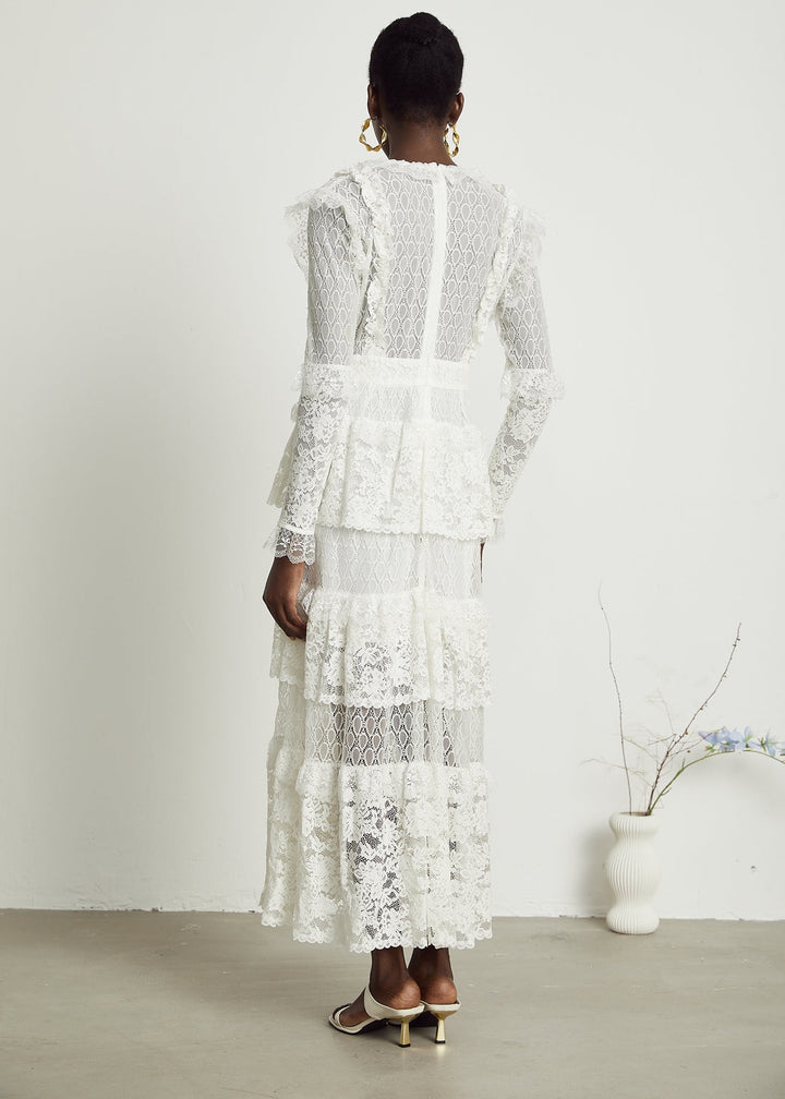 This exquisite maxi dress is crafted from a luxurious lace fabric with a full lining, offering both a delicate aesthetic and comfortable coverage. It features a deep V-neckline adorned with ruffles that extend to the shoulders and down the front of the bodice. The long sleeves are also finished with ruffled tiers, adding a romantic and airy feel. The silhouette is fitted at the waist, then flows into a beautiful tiered skirt, creating a graceful, voluminous shape. Each tier of the skirt is detailed with ruffled seams, enhancing the dress's ethereal quality.
