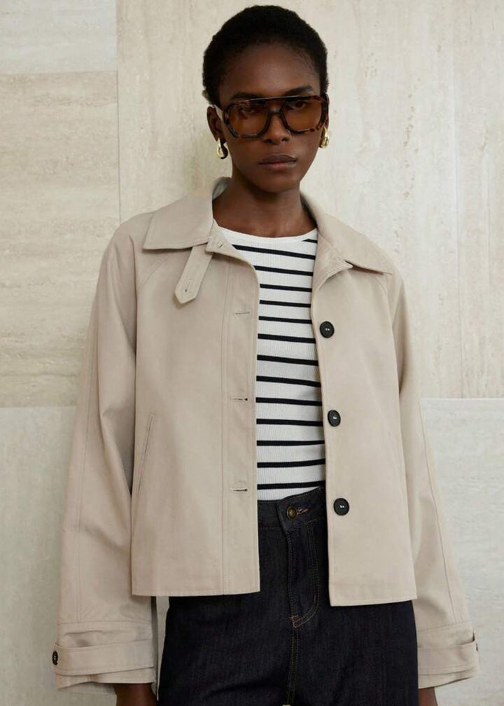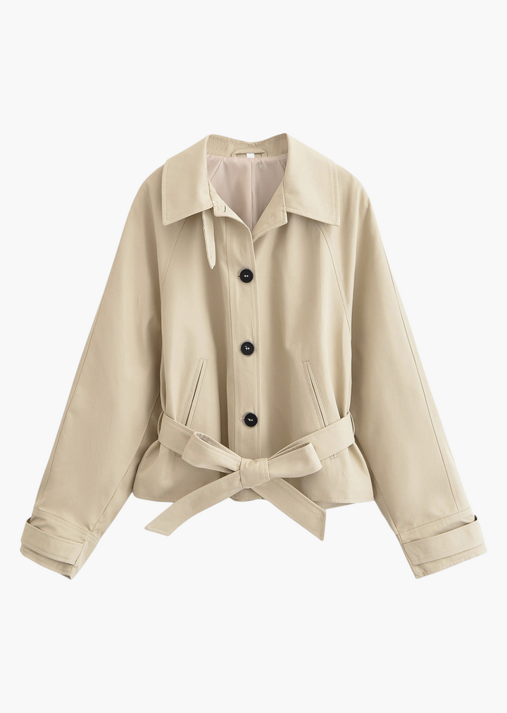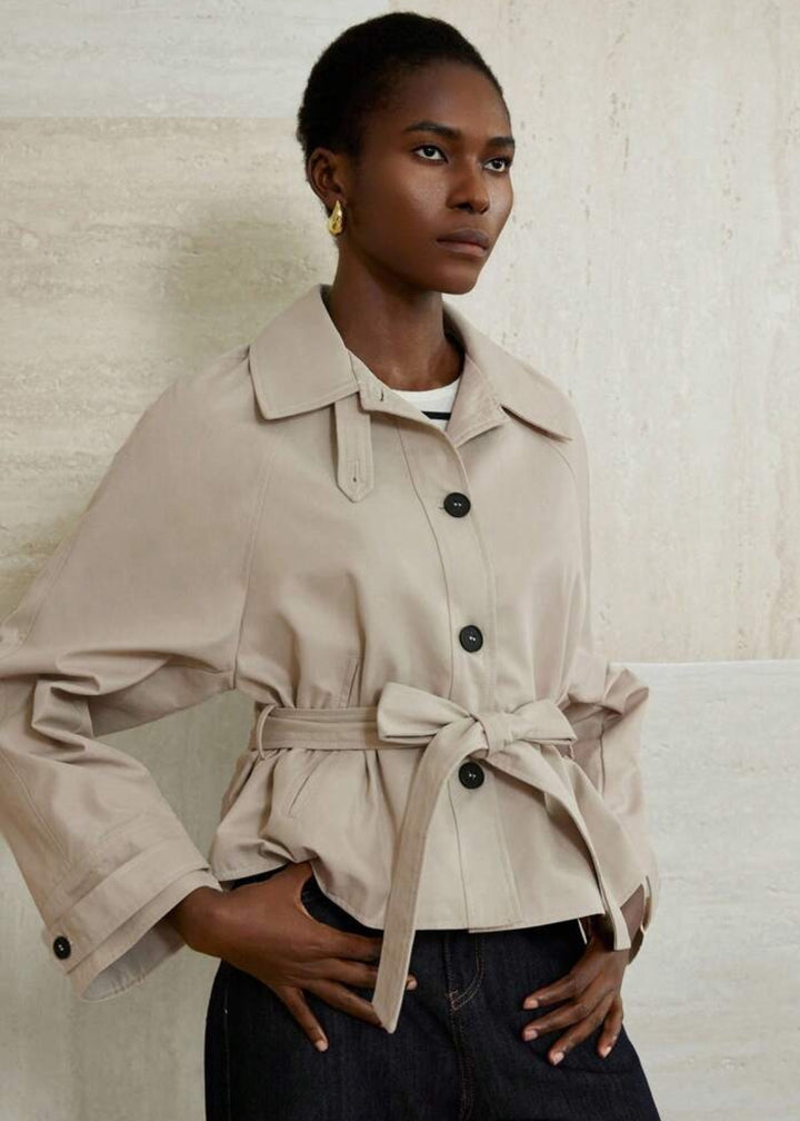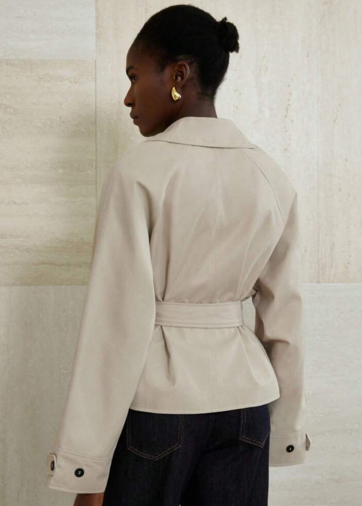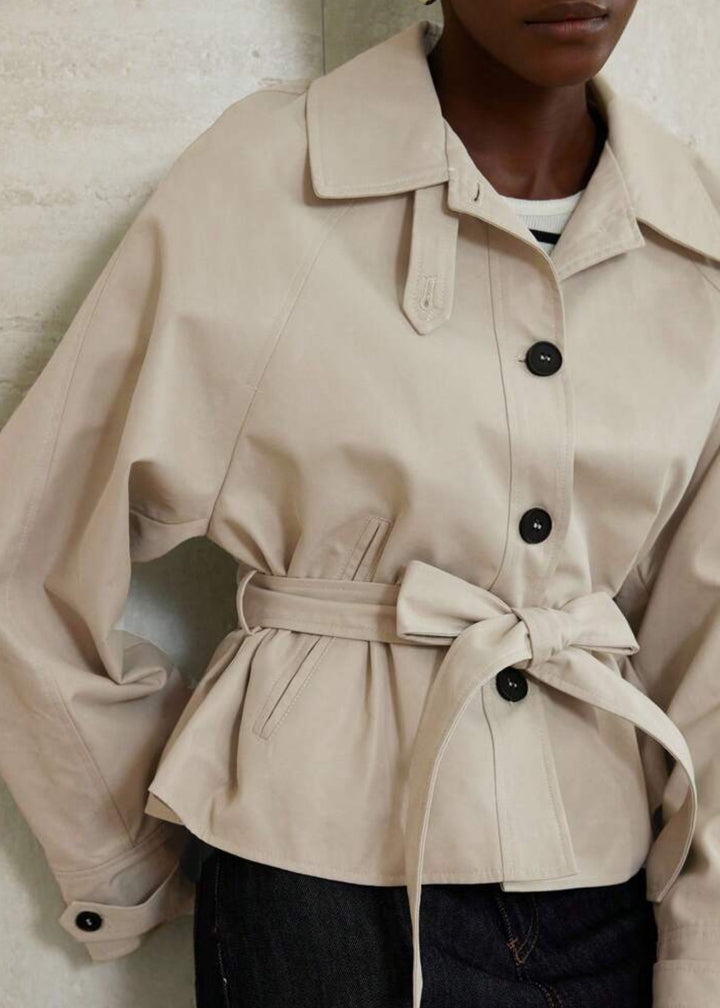 This cropped jacket features a classic collar and a button-front closure. The design is accentuated by a detachable tie belt at the waist, allowing for a cinched silhouette or a more relaxed fit. The raglan sleeves provide a comfortable and stylish drape, while the back storm flap and wrist straps with button closures add a nod to classic trench coat styling.
