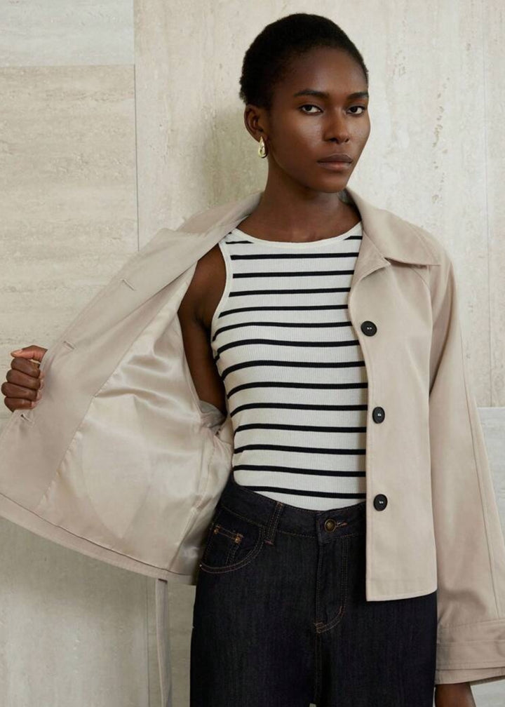 Wear it with the belt tied to define the waist and create a polished look over a simple dress or blouse. For a casual outfit, remove the belt and pair the jacket with high-waisted jeans and a basic t-shirt. Its versatility makes it a perfect layering piece for transitional weather.
