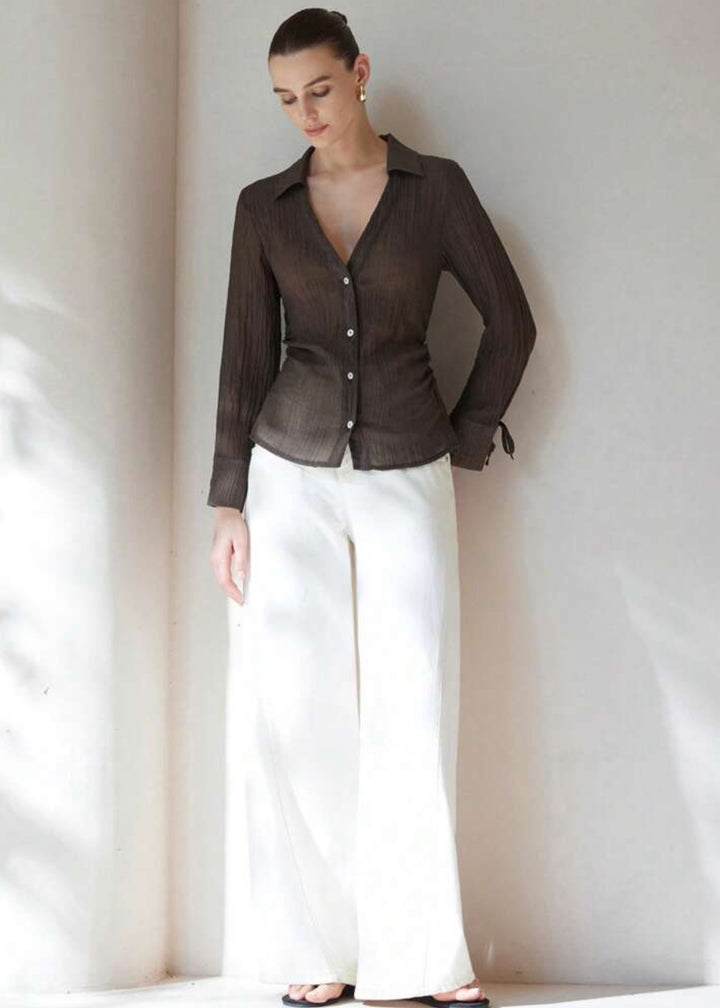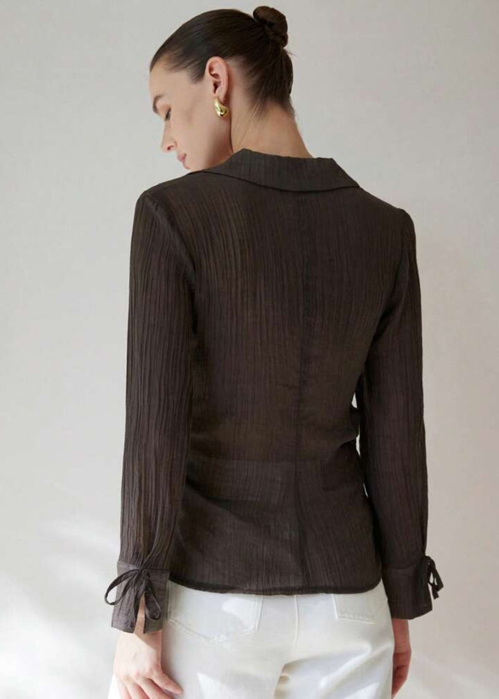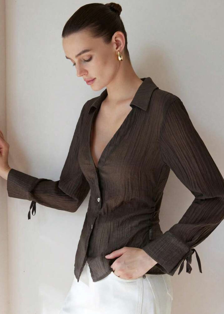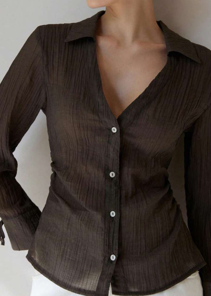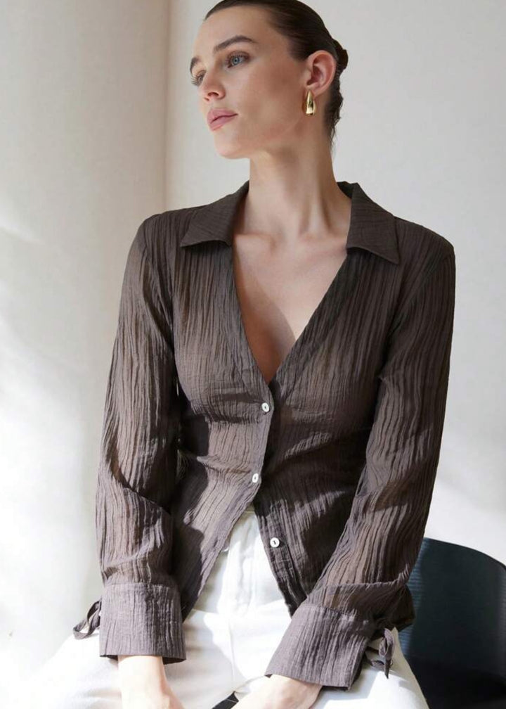 This shirt is a stylish and versatile piece, offering a blend of classic and relaxed elements. It features a classic collared neckline that plunges into a sophisticated V-neck, creating an open and airy feel. The button-front closure allows for adjustable styling. Its long sleeves are adorned with tie cuffs, adding a delicate and feminine detail. Made from a lightweight, textured fabric, this shirt is perfect for layering or wearing on its own.
